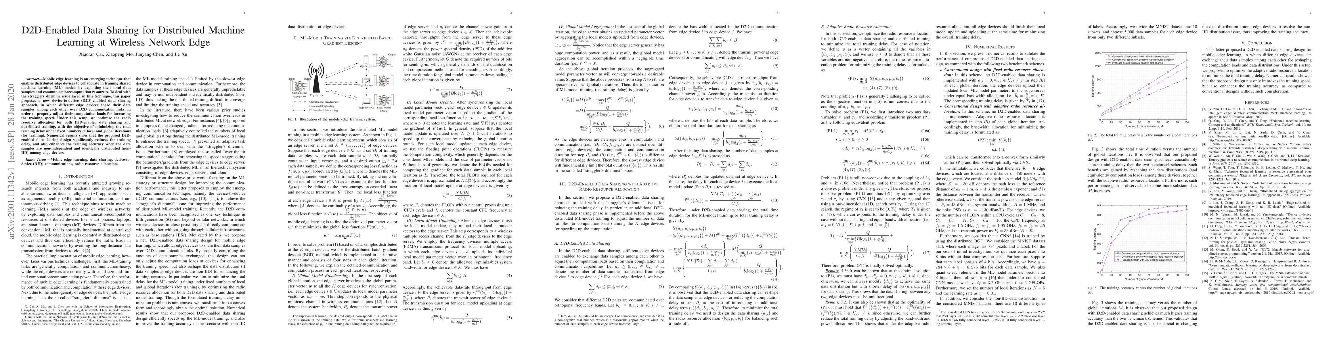 This paper proposes a device-to-device data sharing approach for distributed machine learning at wireless network edge to reduce training delay and enhance accuracy, outperforming existing methods in both scenarios with non-independent and identically distributed data samples.