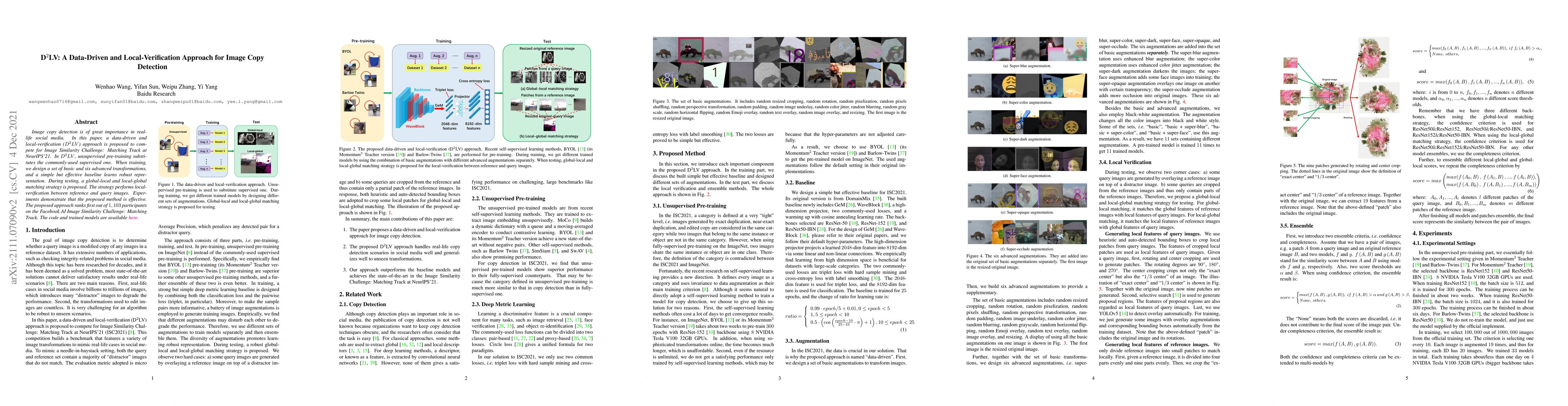 The paper introduces D$^2$LV, a data-driven and local-verification approach for image copy detection, which uses unsupervised pre-training. It employs basic and advanced image transformations for robust representation learning. During testing, a global-local and local-global matching strategy is used for local-verification. D$^2$LV outperformed 1,103 participants in Facebook AI Image Similarity Challenge: Matching Track.