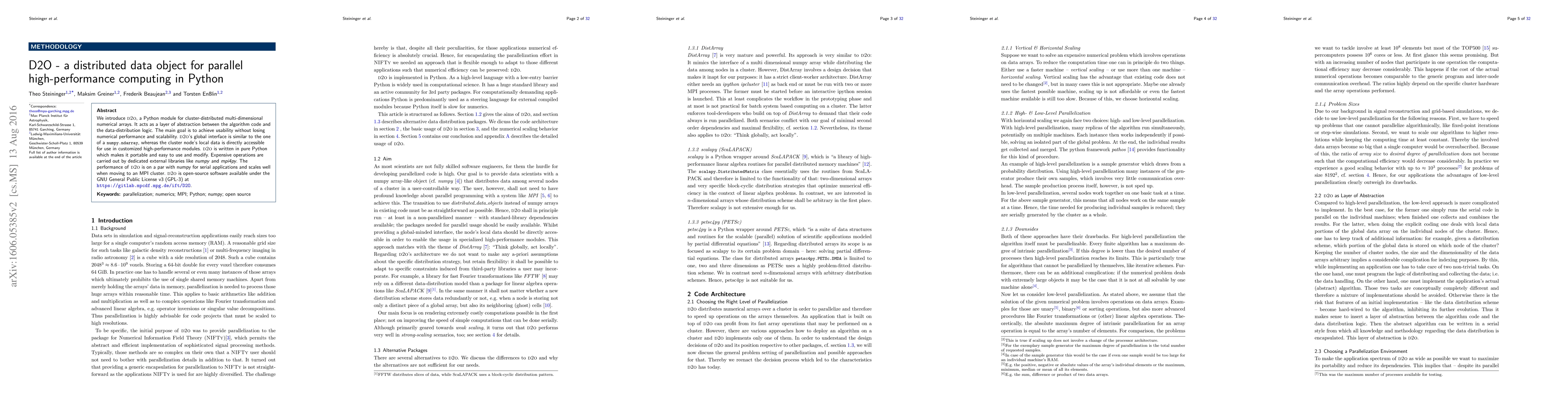 We introduce D2O, a Python module for cluster-distributed multi-dimensional numerical arrays. It acts as a layer of abstraction between the algorithm code and the data-distribution logic. The main goal is to achieve usability without losing numerical performance and scalability. D2O's global interface is similar to the one of a numpy.ndarray, whereas the cluster node's local data is directly accessible for use in customized high-performance modules. D2O is written in pure Python which makes it portable and easy to use and modify. Expensive operations are carried out by dedicated external libraries like numpy and mpi4py. The performance of D2O is on a par with numpy for serial applications and scales well when moving to an MPI cluster. D2O is open-source software available under the GNU General Public License v3 (GPL-3) at https://gitlab.mpcdf.mpg.de/ift/D2O