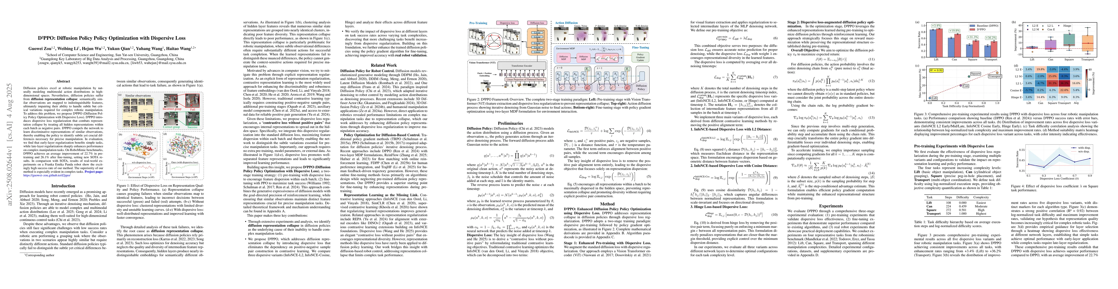 Diffusion policies excel at robotic manipulation by naturally modeling multimodal action distributions in high-dimensional spaces. Nevertheless, diffusion policies suffer from diffusion representation collapse: semantically similar observations are mapped to indistinguishable features, ultimately impairing their ability to handle subtle but critical variations required for complex robotic manipulation. To address this problem, we propose D2PPO (Diffusion Policy Policy Optimization with Dispersive Loss). D2PPO introduces dispersive loss regularization that combats representation collapse by treating all hidden representations within each batch as negative pairs. D2PPO compels the network to learn discriminative representations of similar observations, thereby enabling the policy to identify subtle yet crucial differences necessary for precise manipulation. In evaluation, we find that early-layer regularization benefits simple tasks, while late-layer regularization sharply enhances performance on complex manipulation tasks. On RoboMimic benchmarks, D2PPO achieves an average improvement of 22.7% in pre-training and 26.1% after fine-tuning, setting new SOTA results. In comparison with SOTA, results of real-world experiments on a Franka Emika Panda robot show the excitingly high success rate of our method. The superiority of our method is especially evident in complex tasks. Project page: https://guowei-zou.github.io/d2ppo/