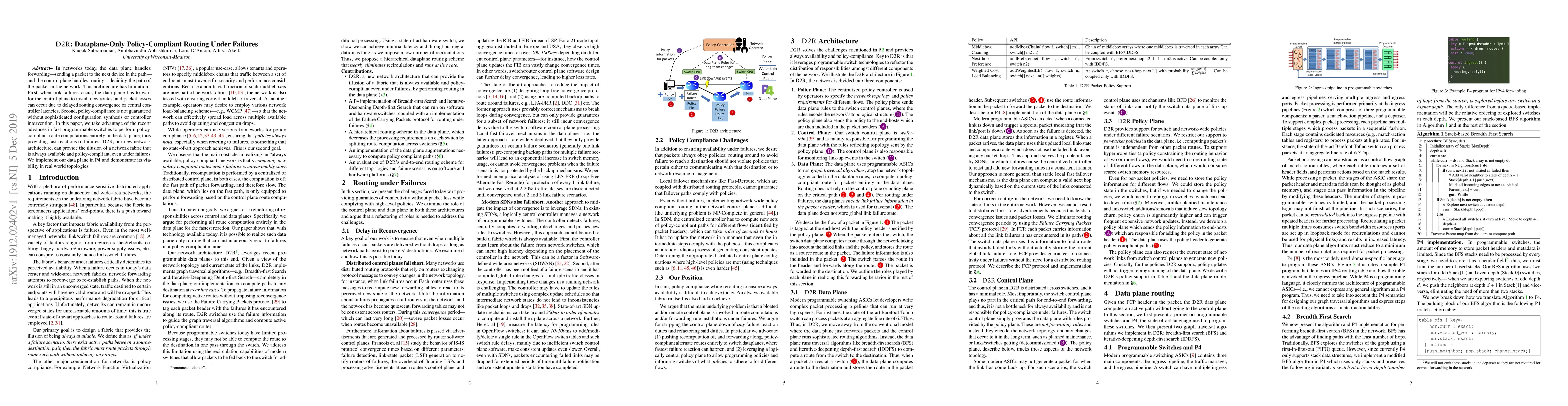 In networks today, the data plane handles forwarding---sending a packet to the next device in the path---and the control plane handles routing---deciding the path of the packet in the network. This architecture has limitations. First, when link failures occur, the data plane has to wait for the control plane to install new routes, and packet losses can occur due to delayed routing convergence or central controller latencies. Second, policy-compliance is not guaranteed without sophisticated configuration synthesis or controller intervention. In this paper, we take advantage of the recent advances in fast programmable switches to perform policy-compliant route computations entirely in the data plane, thus providing fast reactions to failures. D2R, our new network architecture, can provide the illusion of a network fabric that is always available and policy-compliant, even under failures. We implement our data plane in P4 and demonstrate its viability in real world topologies.
