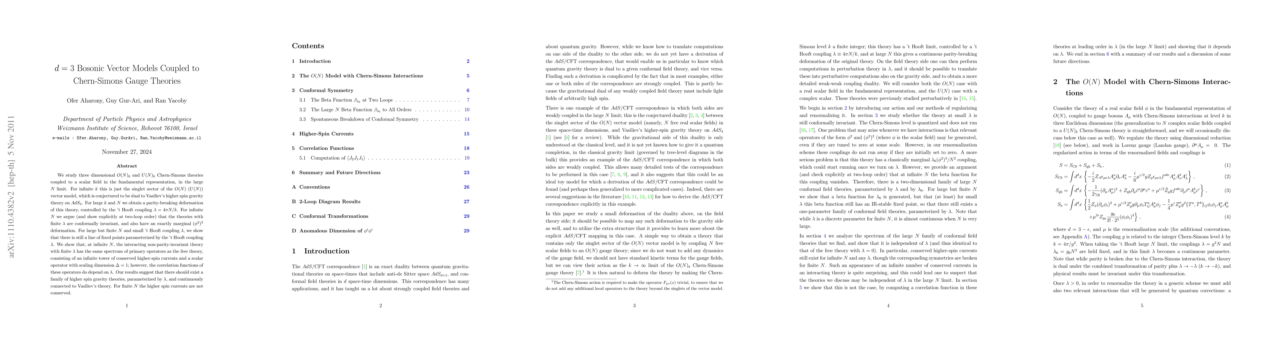 We study three dimensional O(N)_k and U(N)_k Chern-Simons theories coupled to a scalar field in the fundamental representation, in the large N limit. For infinite k this is just the singlet sector of the O(N) (U(N)) vector model, which is conjectured to be dual to Vasiliev's higher spin gravity theory on AdS_4. For large k and N we obtain a parity-breaking deformation of this theory, controlled by the 't Hooft coupling lambda = 4 \pi N / k. For infinite N we argue (and show explicitly at two-loop order) that the theories with finite lambda are conformally invariant, and also have an exactly marginal (\phi^2)^3 deformation. For large but finite N and small 't Hooft coupling lambda, we show that there is still a line of fixed points parameterized by the 't Hooft coupling lambda. We show that, at infinite N, the interacting non-parity-invariant theory with finite lambda has the same spectrum of primary operators as the free theory, consisting of an infinite tower of conserved higher-spin currents and a scalar operator with scaling dimension \Delta=1; however, the correlation functions of these operators do depend on lambda. Our results suggest that there should exist a family of higher spin gravity theories, parameterized by lambda, and continuously connected to Vasiliev's theory. For finite N the higher spin currents are not conserved.