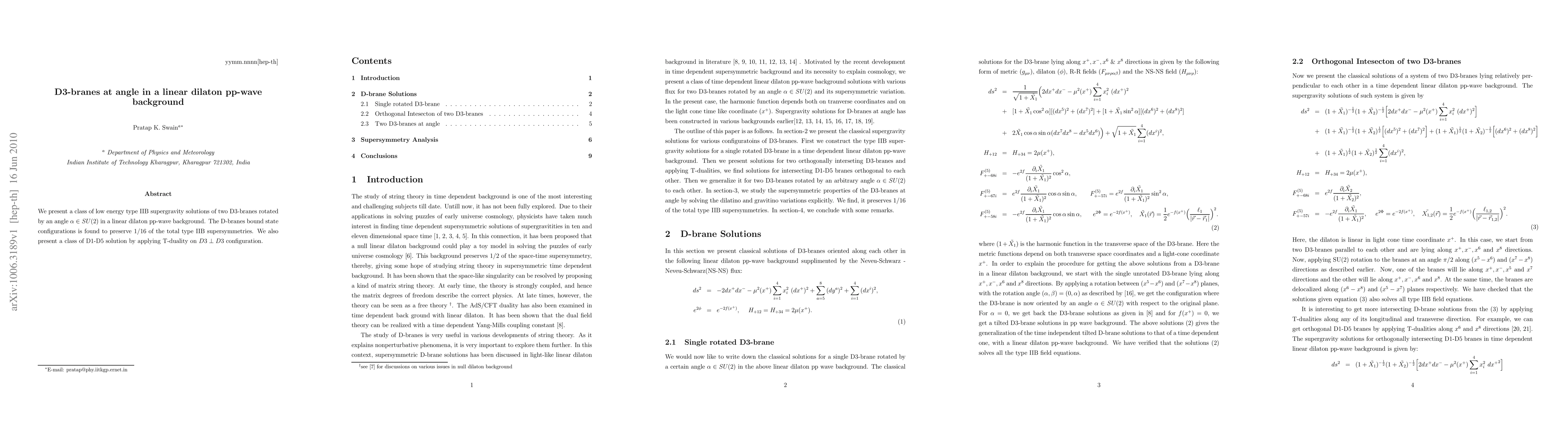 This research explores low energy type IIB supergravity solutions for D3-branes rotated by an angle in a linear dilaton pp-wave background, finding that the configurations preserve 1/16 of the total supersymmetry. It also introduces a D1-D5 solution via T-duality on a perpendicular D3-D3 configuration.