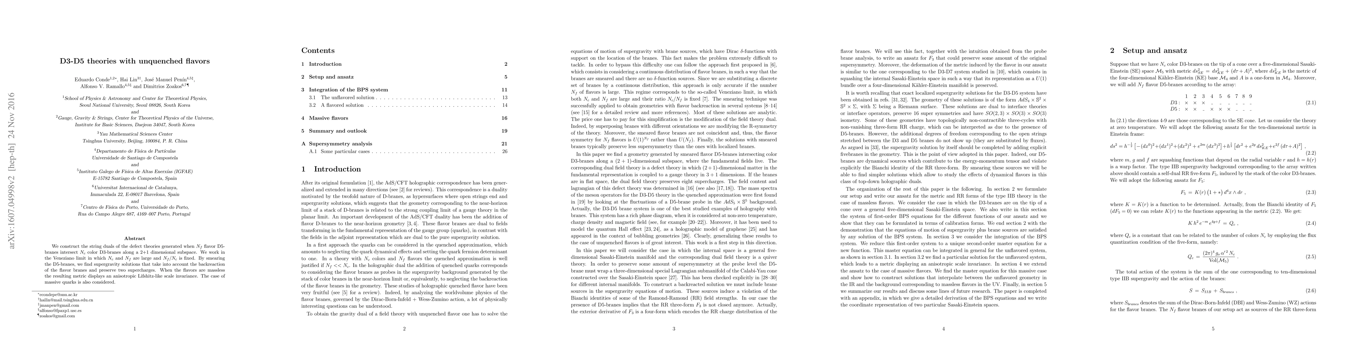 The paper constructs string duals for defect theories from intersecting flavor D5-branes and color D3-branes, finding supergravity solutions that preserve two supercharges. The massless flavor case yields an anisotropic Lifshitz-like scale invariance, while massive quarks are also examined.