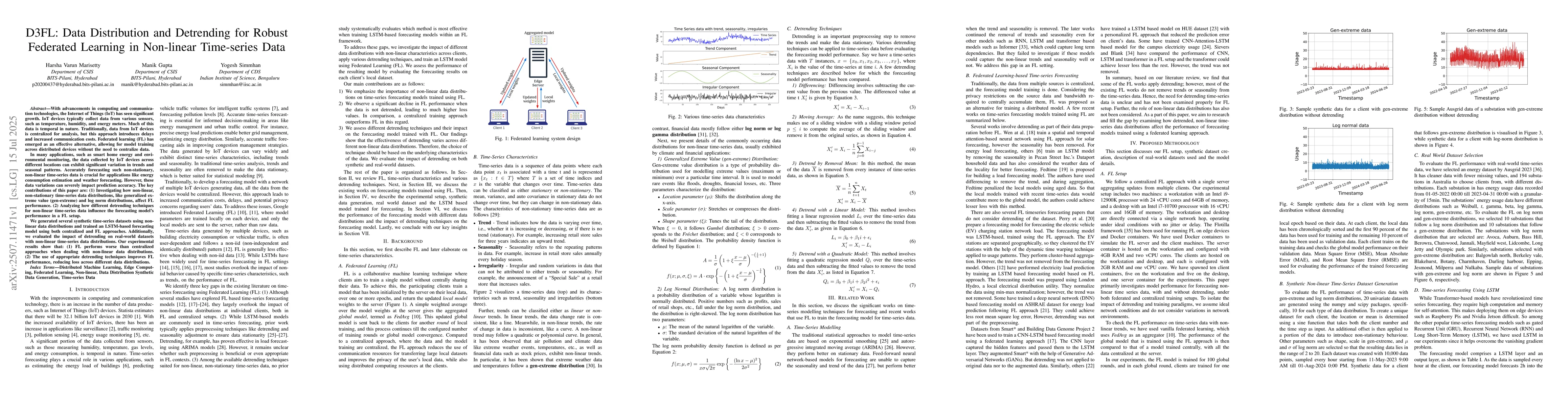 The paper proposes D3FL, a method that investigates the impact of non-linear, non-stationary time-series data distributions and detrending techniques on federated learning performance for time-series forecasting.