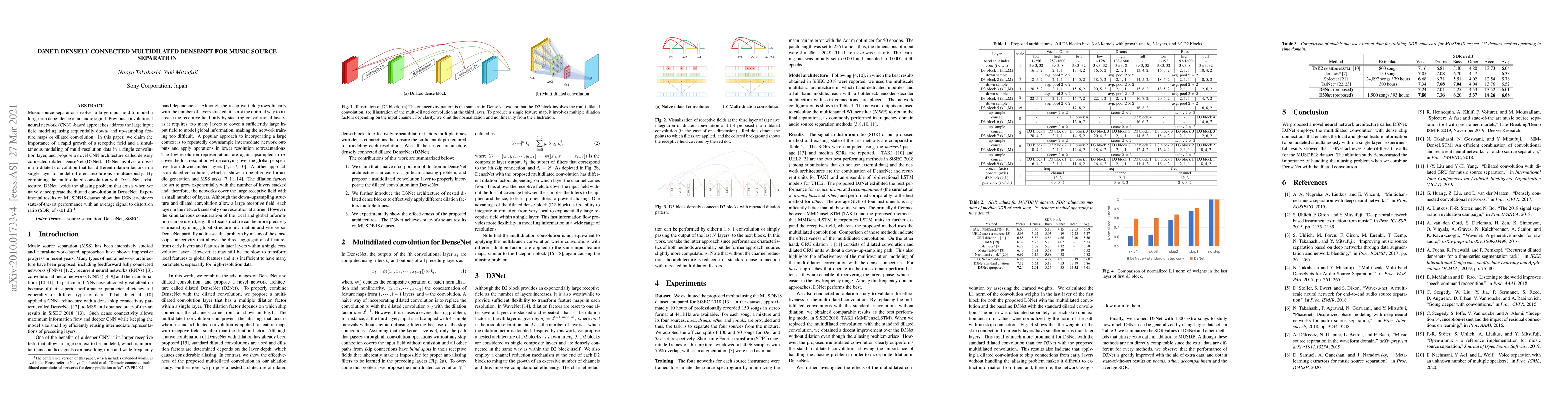 The paper proposes D3Net, a novel CNN architecture for music source separation. D3Net combines multi-dilated convolution and DenseNet, enabling simultaneous modeling of multi-resolution data and rapid growth of receptive field, outperforming previous methods with an average SDR of 6.01 dB on MUSDB18 dataset.