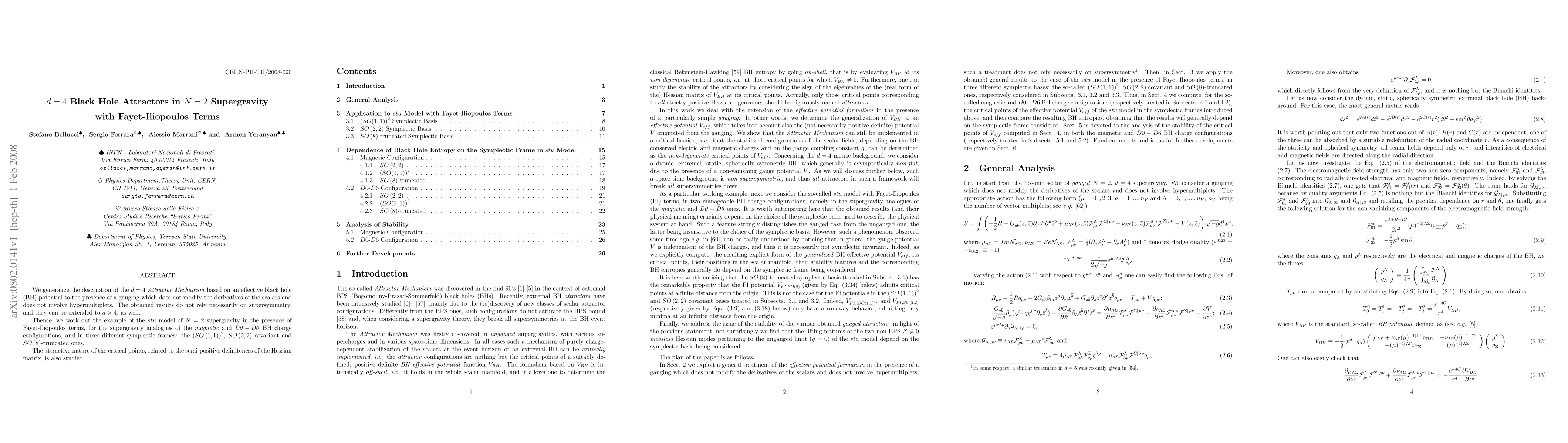 This paper generalizes the Attractor Mechanism for d=4 black hole solutions in N=2 supergravity, incorporating Fayet-Iliopoulos terms without altering scalar derivatives, and explores its applicability beyond four dimensions. It specifically examines the stu model under different symplectic frames, confirming the attractive properties of critical points through the semi-positive definiteness of the Hessian matrix.