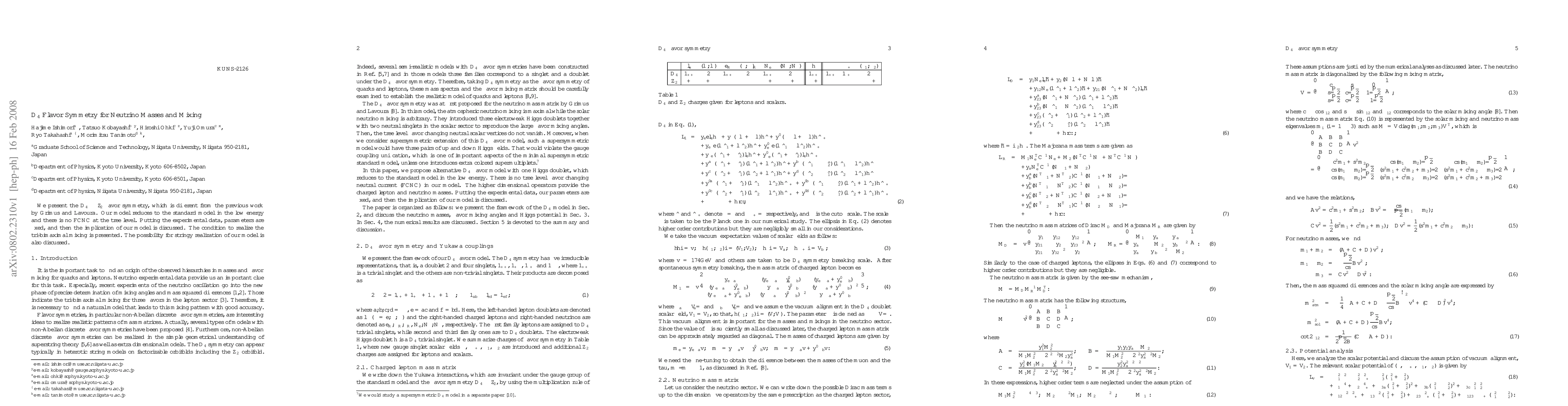 We present the $D_4\times Z_2$ flavor symmetry, which is different from the previous work by Grimus and Lavoura. Our model reduces to the standard model in the low energy and there is no FCNC at the tree level. Putting the experimental data, parameters are fixed, and then the implication of our model is discussed. The condition to realize the tri-bimaximal mixing is presented. The possibility for stringy realization of our model is also discussed.