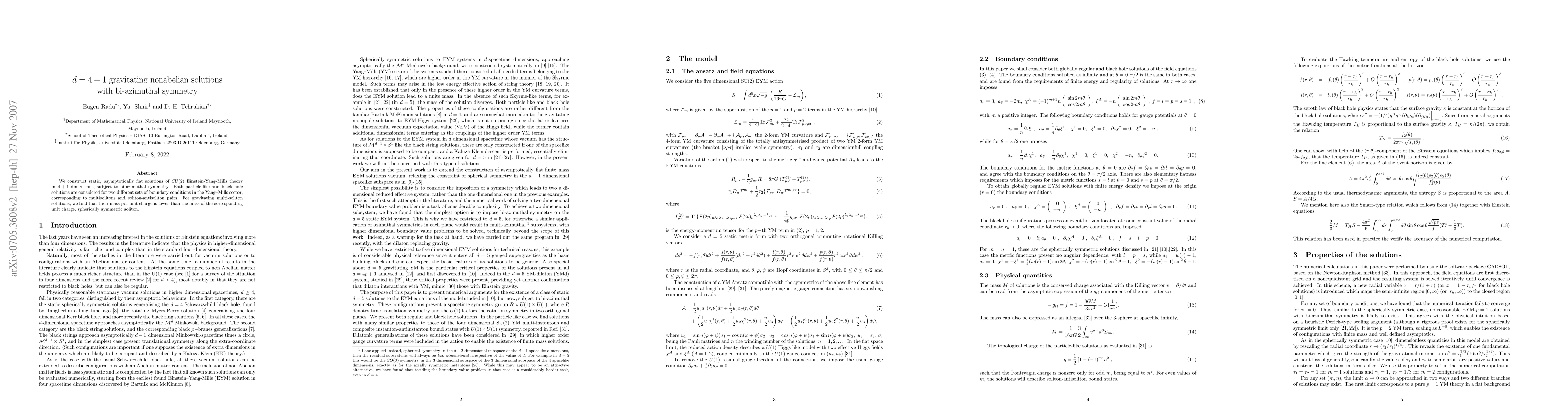 We construct static, asymptotically flat solutions of SU(2) Einstein-Yang-Mills theory in 4+1 dimensions, subject to bi-azimuthal symmetry. Both particle-like and black hole solutions are considered for two different sets of boundary conditions in the Yang--Mills sector, corresponding to multisolitons and soliton-antisoliton pairs. For gravitating multi-soliton solutions, we find that their mass per unit charge is lower than the mass of the corresponding unit charge, spherically symmetric soliton.