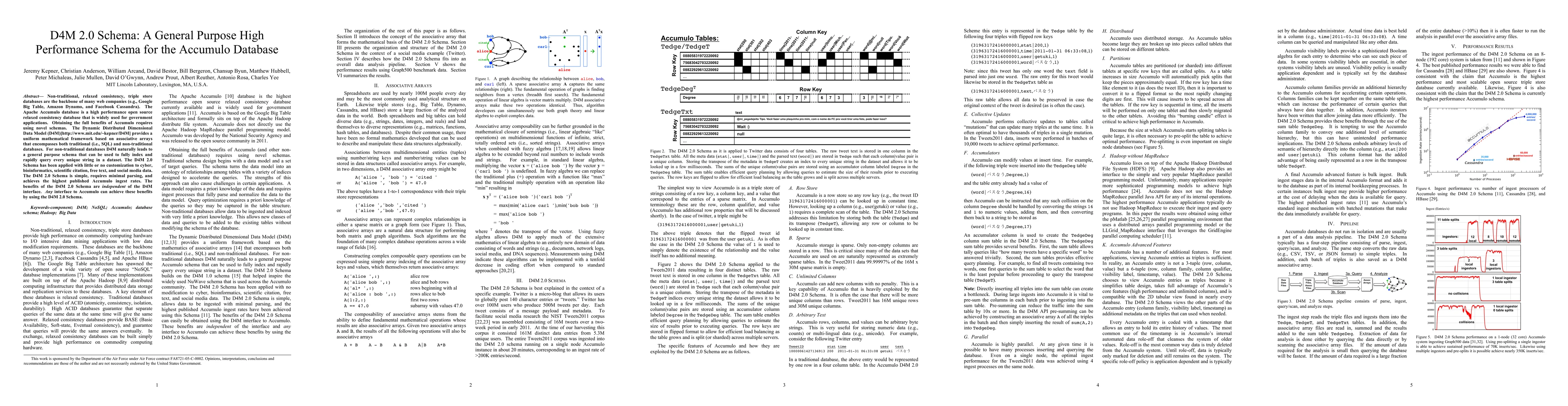 The D4M 2.0 Schema is a high-performance, general-purpose schema for the Apache Accumulo database, designed to maximize ingest rates and query efficiency for various data types. It leverages the Dynamic Distributed Dimensional Data Model to provide a simple, customizable schema that achieves optimal performance for diverse datasets.