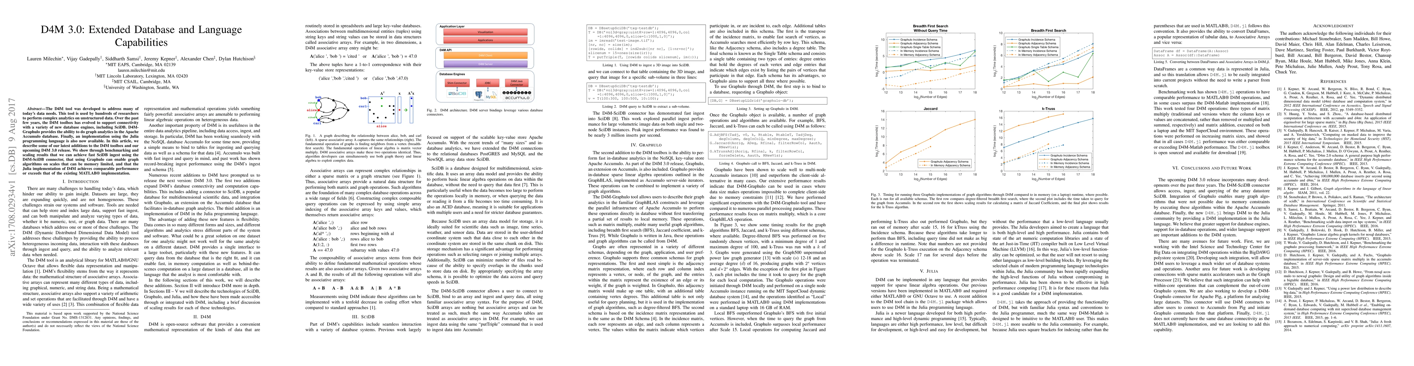 D4M 3.0 enhances data analytics capabilities with new database engine support and graph analytics, including a Julia implementation. Benchmarks demonstrate improved performance in SciDB ingest, scalable graph analytics, and competitive speed with the existing MATLAB implementation.