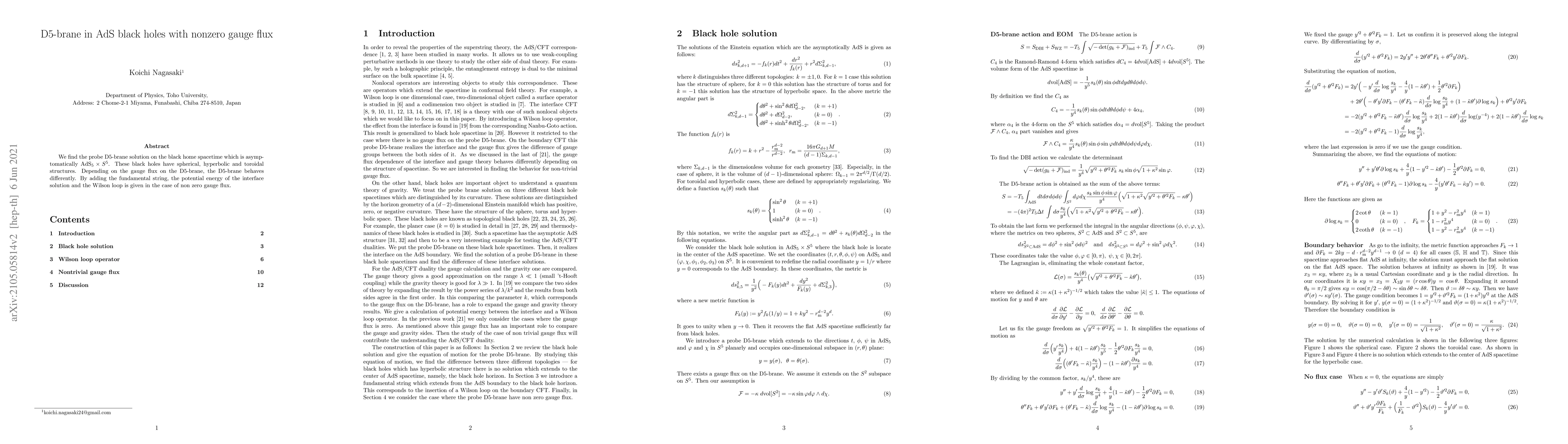 This paper investigates the behavior of a probe D5-brane in the background of AdS black holes with non-zero gauge flux, revealing distinct interactions based on the brane's gauge flux and the resulting potential energy for the interface solution and Wilson loop.