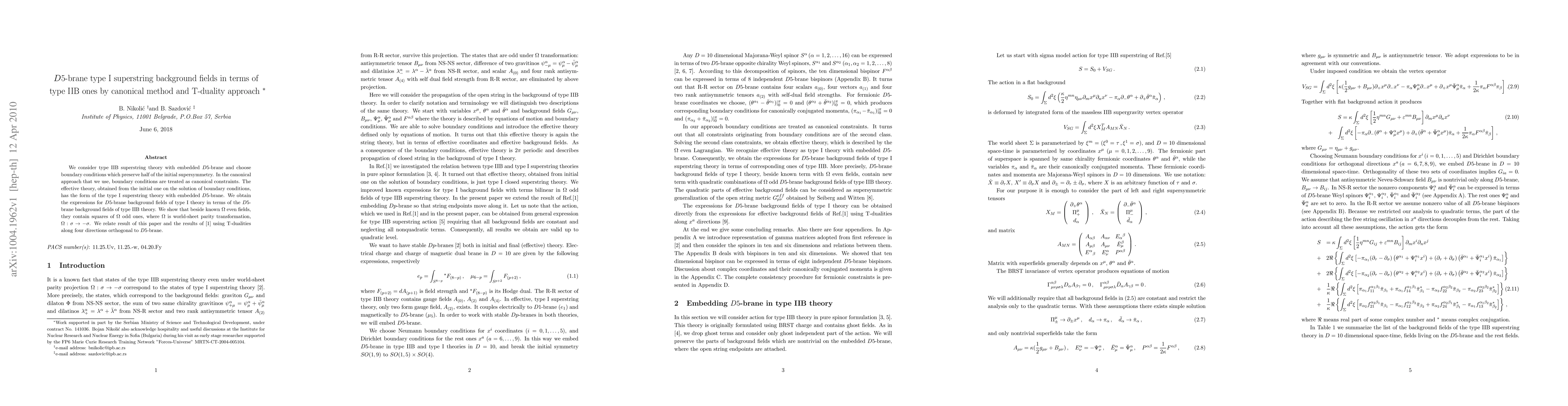 We consider type IIB superstring theory with embedded $D5$-brane and choose boundary conditions which preserve half of the initial supersymmetry. In the canonical approach that we use, boundary conditions are treated as canonical constraints. The effective theory, obtained from the initial one on the solution of boundary conditions, has the form of the type I superstring theory with embedded $D5$-brane. We obtain the expressions for $D5$-brane background fields of type I theory in terms of the $D5$-brane background fields of type IIB theory. We show that beside known $\Omega$ even fields, they contain squares of $\Omega$ odd ones, where $\Omega$ is world-sheet parity transformation, $\Omega:\sigma\to -\sigma$. We relate result of this paper and the results of [1] using T-dualities along four directions orthogonal to $D5$-brane.