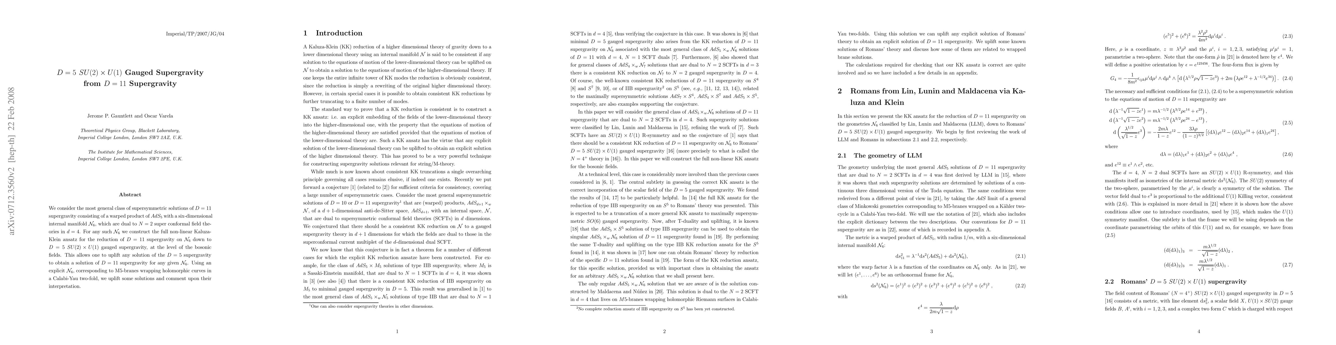 This paper constructs the full non-linear Kaluza-Klein ansatz for reducing D=11 supergravity to D=5 SU(2)xU(1) gauged supergravity on a six-dimensional manifold N_6, allowing the uplift of D=5 solutions to D=11. It provides an explicit example using M5-branes wrapping curves in a Calabi-Yau two-fold and discusses the interpretation of uplifted solutions.