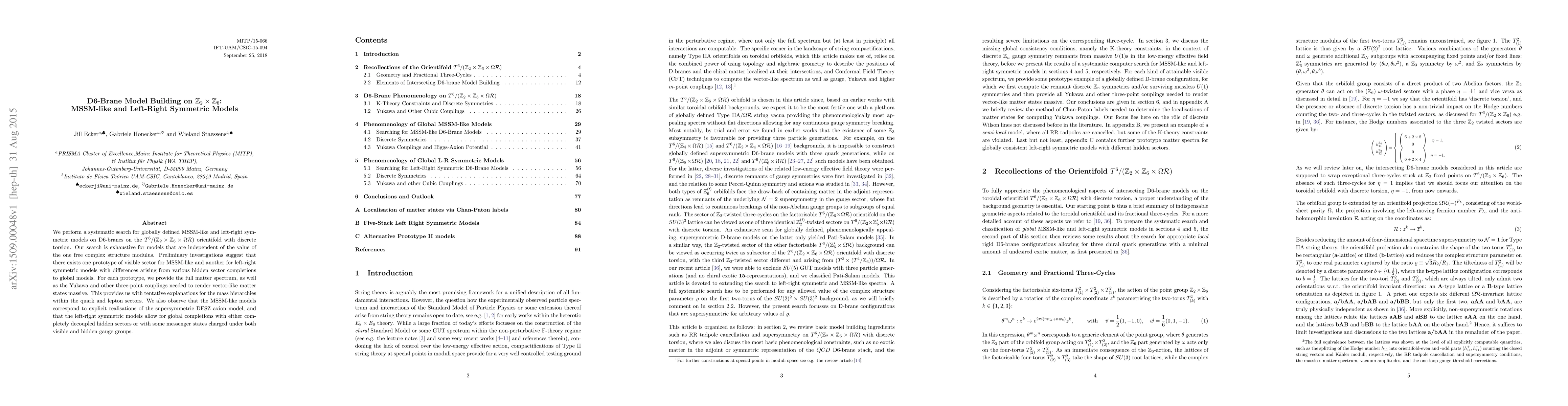We perform a systematic search for globally defined MSSM-like and left-right symmetric models on D6-branes on the T6/Z(2)xZ(6)xOR orientifold with discrete torsion. Our search is exhaustive for models that are independent of the value of the one free complex structure modulus. Preliminary investigations suggest that there exists one prototype of visible sector for MSSM-like and another for left-right symmetric models with differences arising from various hidden sector completions to global models. For each prototype, we provide the full matter spectrum, as well as the Yukawa and other three-point couplings needed to render vector-like matter states massive. This provides us with tentative explanations for the mass hierarchies within the quark and lepton sectors. We also observe that the MSSM-like models correspond to explicit realisations of the supersymmetric DFSZ axion model, and that the left-right symmetric models allow for global completions with either completely decoupled hidden sectors or with some messenger states charged under both visible and hidden gauge groups.