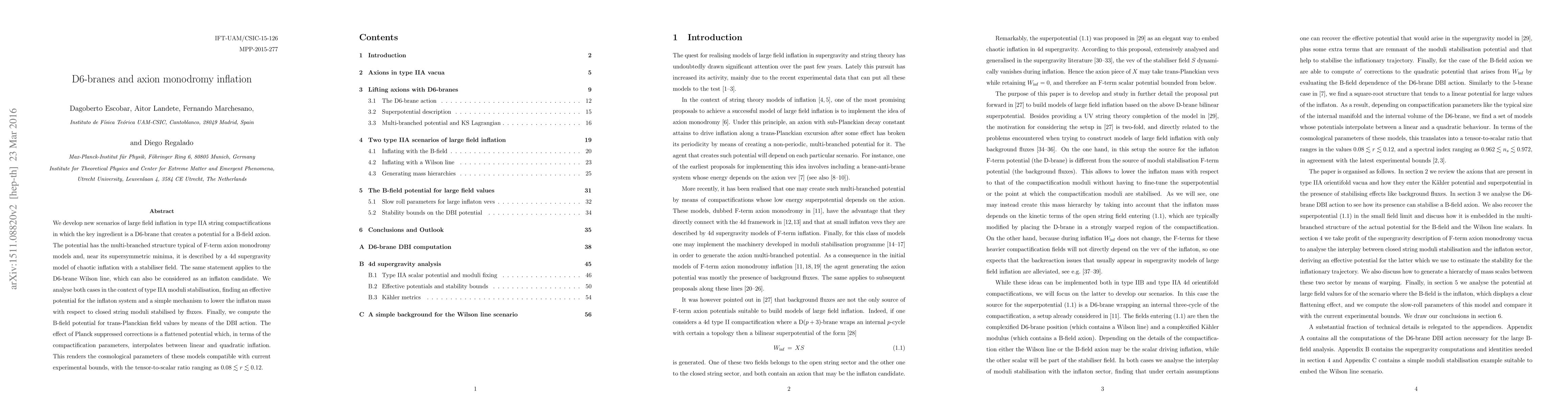 This paper explores large field inflation scenarios in type IIA string theory using D6-branes to create potentials for B-field axions, leading to multi-branched axion monodromy inflation. It also investigates the D6-brane Wilson line as an inflaton candidate, finding a mechanism that lowers the inflaton mass and results in a flattened potential compatible with experimental bounds.