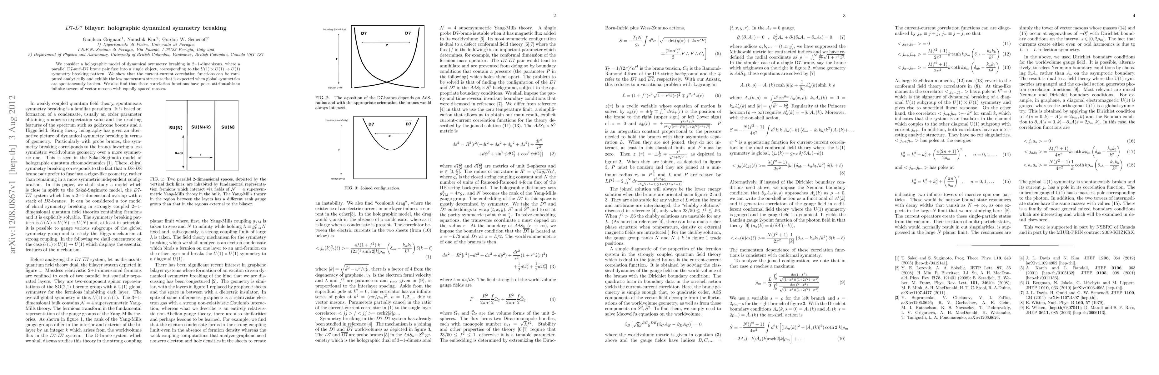 We consider a holographic model of dynamical symmetry breaking in 2+1-dimenisons, where a parallel D7-anti-D7 brane pair fuse into a single object, corresponding to the U(1)XU(1)->U(1) symmetry breaking pattern. We show that the current-current correlation functions can be computed analytically and exhibit the low momentum structure that is expected when global symmetries are spontaneously broken. We also find that these correlation functions have poles attributable to infinite towers of vector mesons with equally spaced masses.