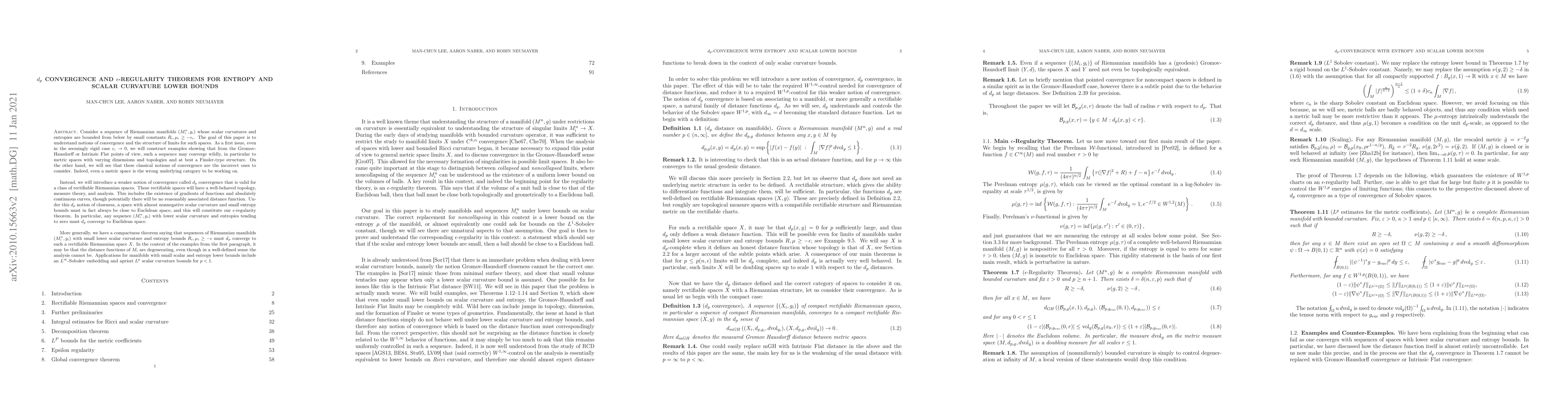 This paper explores convergence and structure in sequences of Riemannian manifolds with bounded scalar curvature and entropy, introducing $d_p$ convergence for rectifiable spaces. It demonstrates that classical convergence notions are inadequate, leading to an $\epsilon$-regularity theorem showing that such spaces are close to Euclidean under $d_p$ convergence.
