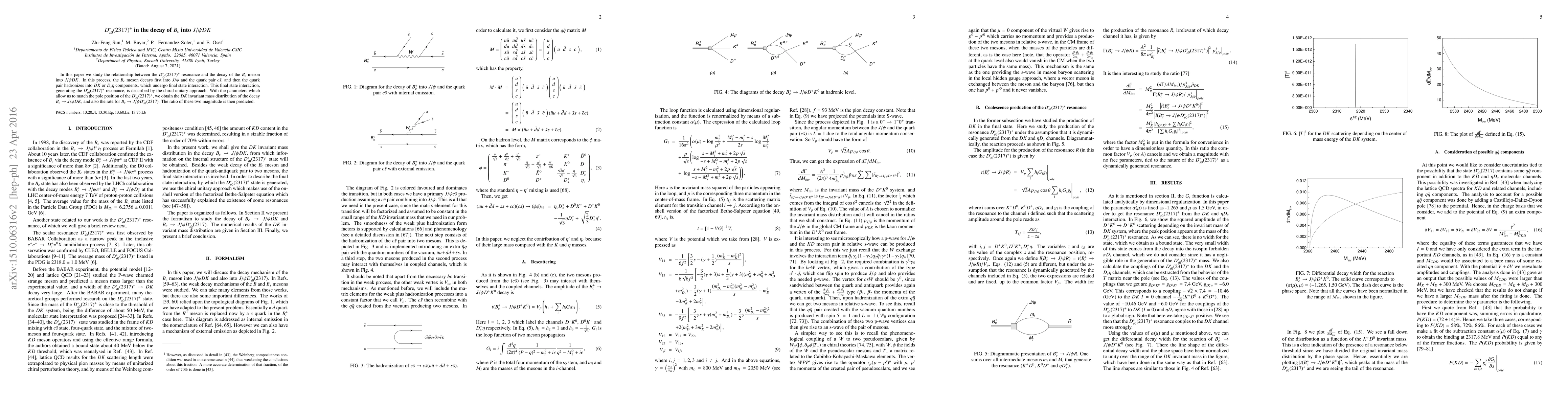 Researchers studied the relationship between a $D_{s0}^{*}(2317)^+$ resonance and the decay of $B_c$ into $J/ ho DK$, using the chiral unitary approach to describe final state interaction. They predicted the invariant mass distribution of the decay and the ratio of two magnitude values.