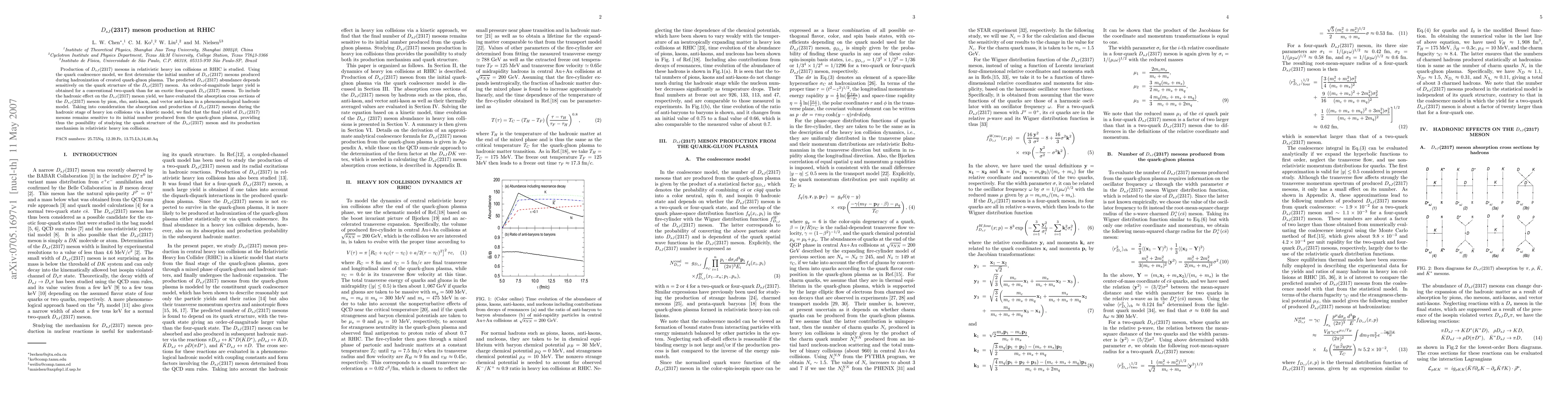 Production of $D_{sJ}$(2317) mesons in relativistic heavy ion collisions at RHIC is studied. Using the quark coalescence model, we first determine the initial number of $D_{sJ}$(2317) mesons produced during hadronization of created quark-gluon plasma. The predicted $D_{sJ}$(2317) abundance depends sensitively on the quark structure of the $D_{sJ}$(2317) meson. An order-of-magnitude larger yield is obtained for a conventional two-quark than for an exotic four-quark $D_{sJ}$(2317) meson. To include the hadronic effect on the $D_{sJ}$(2317) meson yield, we have evaluated the absorption cross sections of the $D_{sJ}$(2317) meson by pion, rho, anti-kaon, and vector anti-kaon in a phenomenological hadronic model. Taking into consideration the absorption and production of $D_{sJ}$(2317) mesons during the hadronic stage of heavy ion collisions via a kinetic model, we find that the final yield of $D_{sJ}$(2317) mesons remains sensitive to its initial number produced from the quark-gluon plasma, providing thus the possibility of studying the quark structure of the $D_{sJ}$(2317) meson and its production mechanism in relativistic heavy ion collisions.