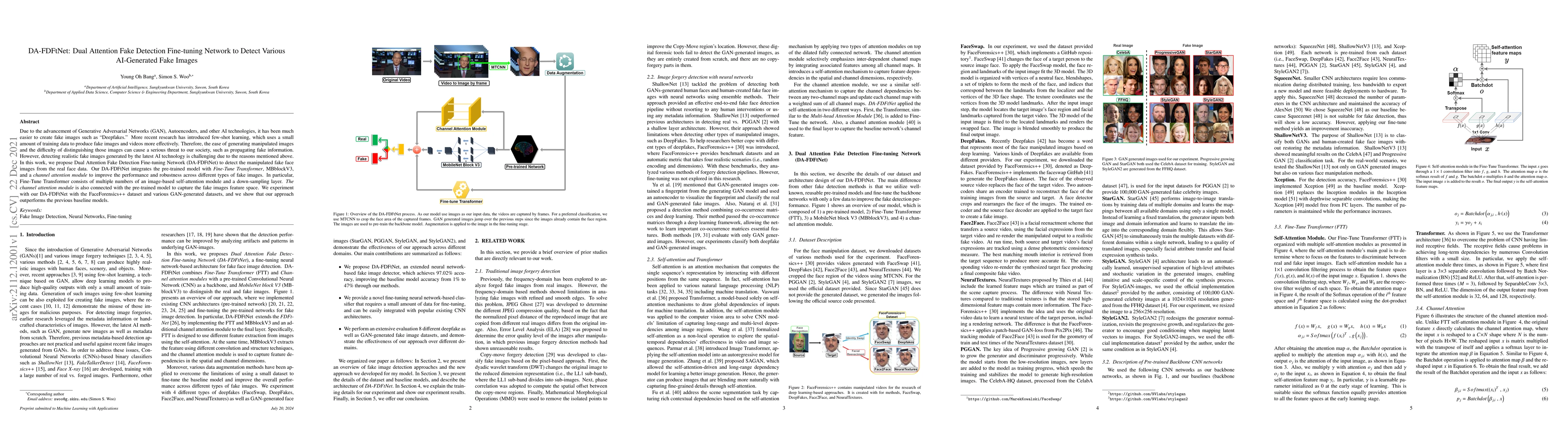 The paper proposes DA-FDFtNet, a Dual Attention Fake Detection Fine-tuning Network, to identify AI-generated fake images, integrating Fine-Tune Transformer, MBblockV3, and a channel attention module for enhanced detection. Experiments on the FaceForensics++ and GAN-generated datasets demonstrate superior performance compared to previous models.