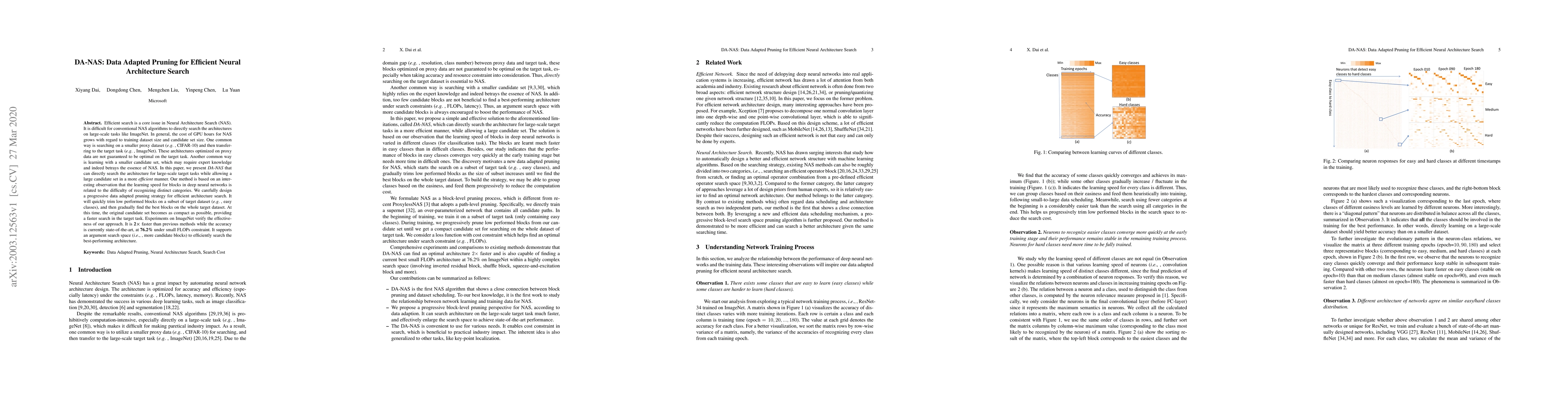 DA-NAS introduces a progressive data adapted pruning strategy for efficient neural architecture search on large-scale tasks like ImageNet, achieving 2x faster search while maintaining state-of-the-art accuracy at 76.2% under small FLOPs constraints. This method efficiently trims low-performing blocks on easy classes before optimizing the full architecture, allowing for a larger candidate set.
