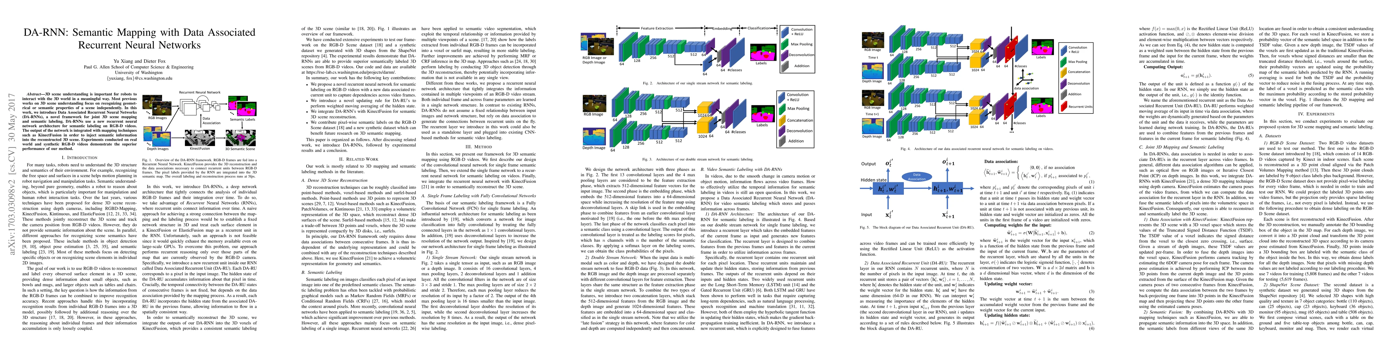 This paper introduces Data Associated Recurrent Neural Networks (DA-RNNs) for joint 3D scene mapping and semantic labeling. The DA-RNN framework integrates semantic information into 3D reconstructions using techniques like KinectFusion.