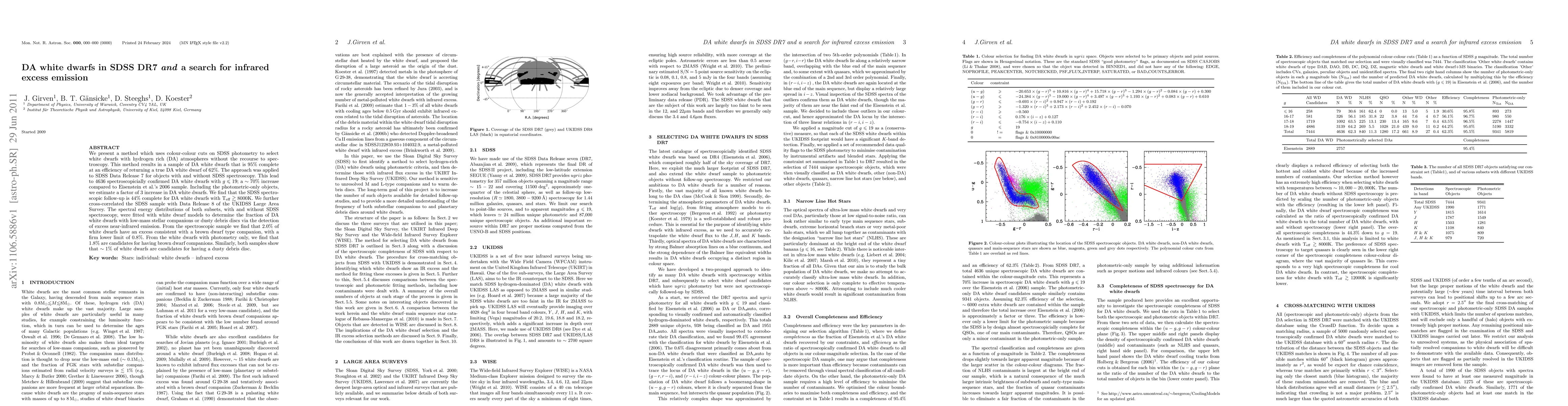 This paper presents a method to identify DA white dwarfs using SDSS photometry, resulting in a 95% complete sample with a 62% efficiency. The study finds a significant increase in DA white dwarfs compared to previous samples and identifies a small fraction (~2%) with infrared excess indicative of brown dwarf companions or dusty debris discs.
