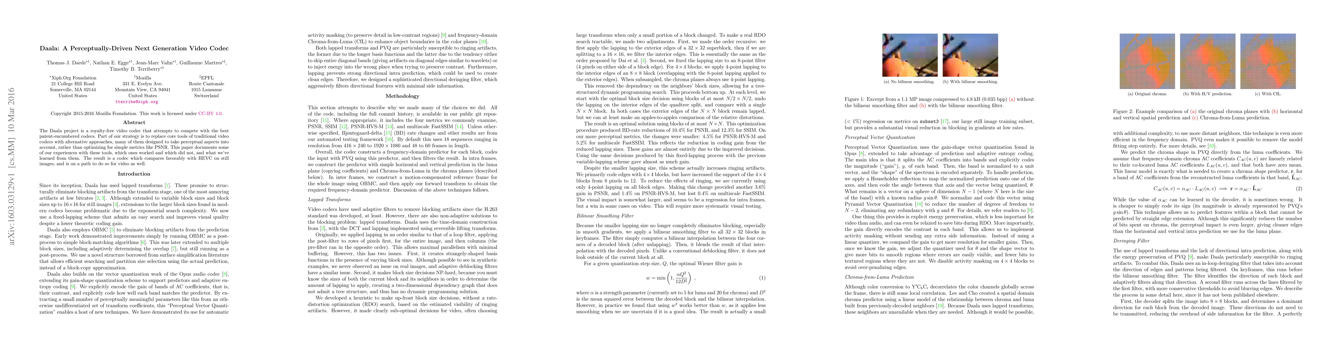 The Daala project develops a royalty-free video codec focusing on perceptual quality rather than traditional metrics, achieving competitive results with HEVC for still images and aiming for similar performance in video. The research highlights the effectiveness of perceptually-driven design choices in codec development.