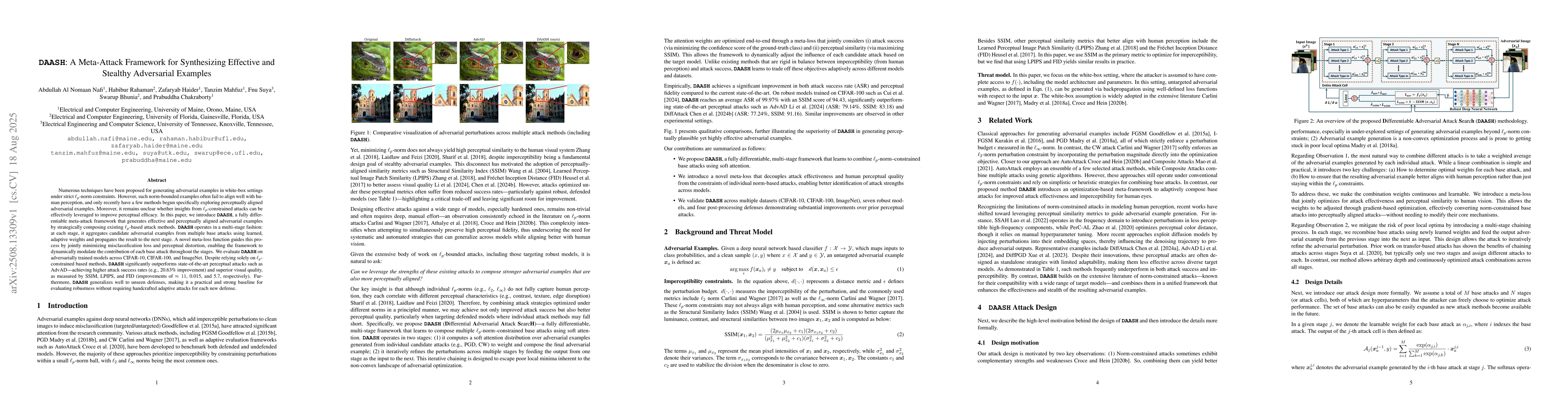 Numerous techniques have been proposed for generating adversarial examples in white-box settings under strict Lp-norm constraints. However, such norm-bounded examples often fail to align well with human perception, and only recently have a few methods begun specifically exploring perceptually aligned adversarial examples. Moreover, it remains unclear whether insights from Lp-constrained attacks can be effectively leveraged to improve perceptual efficacy. In this paper, we introduce DAASH, a fully differentiable meta-attack framework that generates effective and perceptually aligned adversarial examples by strategically composing existing Lp-based attack methods. DAASH operates in a multi-stage fashion: at each stage, it aggregates candidate adversarial examples from multiple base attacks using learned, adaptive weights and propagates the result to the next stage. A novel meta-loss function guides this process by jointly minimizing misclassification loss and perceptual distortion, enabling the framework to dynamically modulate the contribution of each base attack throughout the stages. We evaluate DAASH on adversarially trained models across CIFAR-10, CIFAR-100, and ImageNet. Despite relying solely on Lp-constrained based methods, DAASH significantly outperforms state-of-the-art perceptual attacks such as AdvAD -- achieving higher attack success rates (e.g., 20.63\% improvement) and superior visual quality, as measured by SSIM, LPIPS, and FID (improvements $\approx$ of 11, 0.015, and 5.7, respectively). Furthermore, DAASH generalizes well to unseen defenses, making it a practical and strong baseline for evaluating robustness without requiring handcrafted adaptive attacks for each new defense.