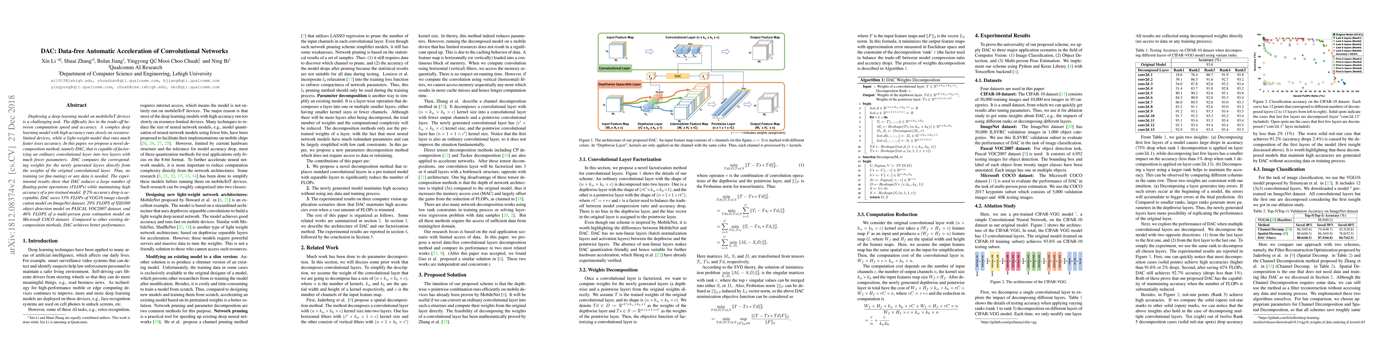 Deploying a deep learning model on mobile/IoT devices is a challenging task. The difficulty lies in the trade-off between computation speed and accuracy. A complex deep learning model with high accuracy runs slowly on resource-limited devices, while a light-weight model that runs much faster loses accuracy. In this paper, we propose a novel decomposition method, namely DAC, that is capable of factorizing an ordinary convolutional layer into two layers with much fewer parameters. DAC computes the corresponding weights for the newly generated layers directly from the weights of the original convolutional layer. Thus, no training (or fine-tuning) or any data is needed. The experimental results show that DAC reduces a large number of floating-point operations (FLOPs) while maintaining high accuracy of a pre-trained model. If 2% accuracy drop is acceptable, DAC saves 53% FLOPs of VGG16 image classification model on ImageNet dataset, 29% FLOPS of SSD300 object detection model on PASCAL VOC2007 dataset, and 46% FLOPS of a multi-person pose estimation model on Microsoft COCO dataset. Compared to other existing decomposition methods, DAC achieves better performance.