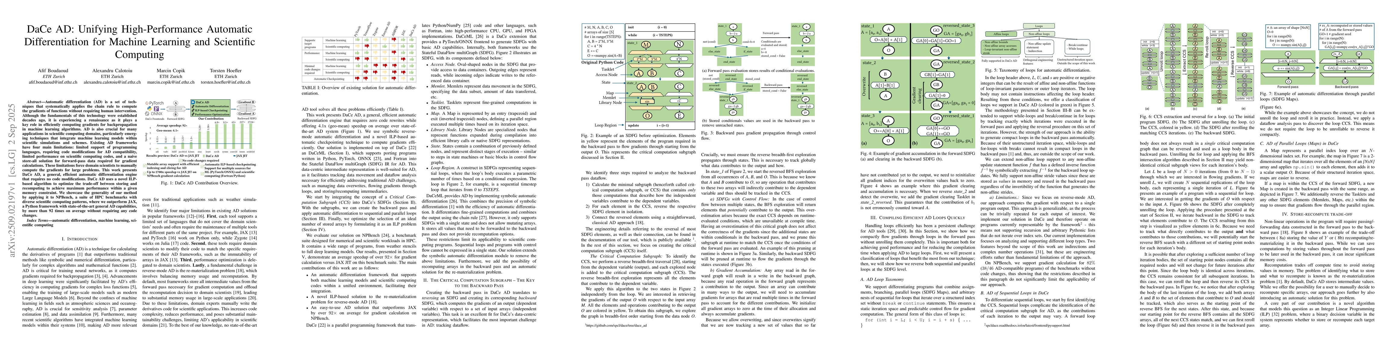 Automatic differentiation (AD) is a set of techniques that systematically applies the chain rule to compute the gradients of functions without requiring human intervention. Although the fundamentals of this technology were established decades ago, it is experiencing a renaissance as it plays a key role in efficiently computing gradients for backpropagation in machine learning algorithms. AD is also crucial for many applications in scientific computing domains, particularly emerging techniques that integrate machine learning models within scientific simulations and schemes. Existing AD frameworks have four main limitations: limited support of programming languages, requiring code modifications for AD compatibility, limited performance on scientific computing codes, and a naive store-all solution for forward-pass data required for gradient calculations. These limitations force domain scientists to manually compute the gradients for large problems. This work presents DaCe AD, a general, efficient automatic differentiation engine that requires no code modifications. DaCe AD uses a novel ILP-based algorithm to optimize the trade-off between storing and recomputing to achieve maximum performance within a given memory constraint. We showcase the generality of our method by applying it to NPBench, a suite of HPC benchmarks with diverse scientific computing patterns, where we outperform JAX, a Python framework with state-of-the-art general AD capabilities, by more than 92 times on average without requiring any code changes.