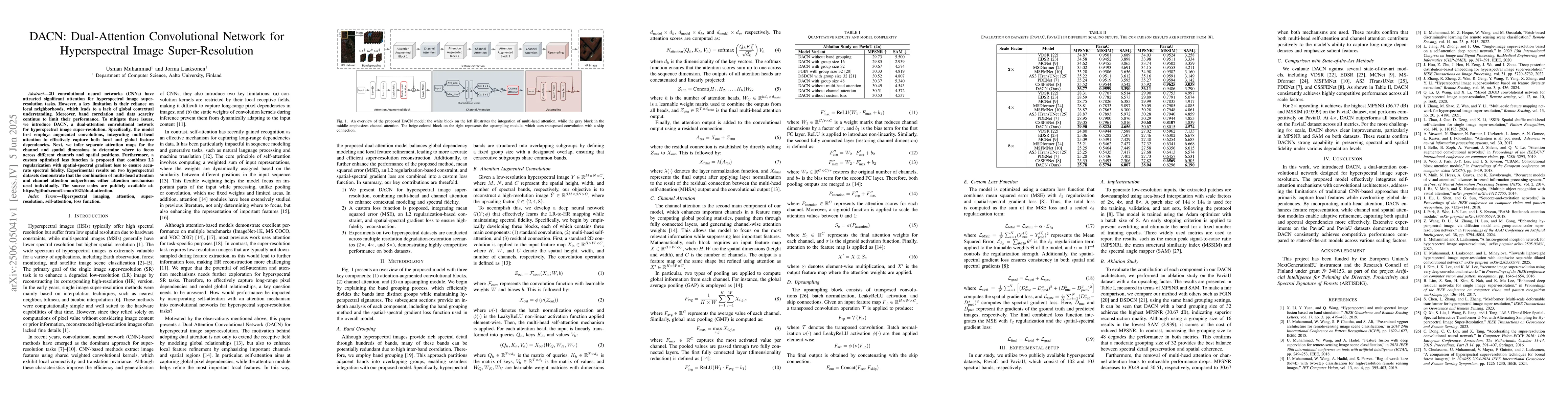 The research introduces DACN, a dual-attention convolutional network that uses augmented convolutions with multi-head attention to capture local and global feature dependencies in hyperspectral image super-resolution tasks. It infers separate attention maps for channel and spatial dimensions, and employs a custom loss function combining L2 regularization with spatial-spectral gradient loss.