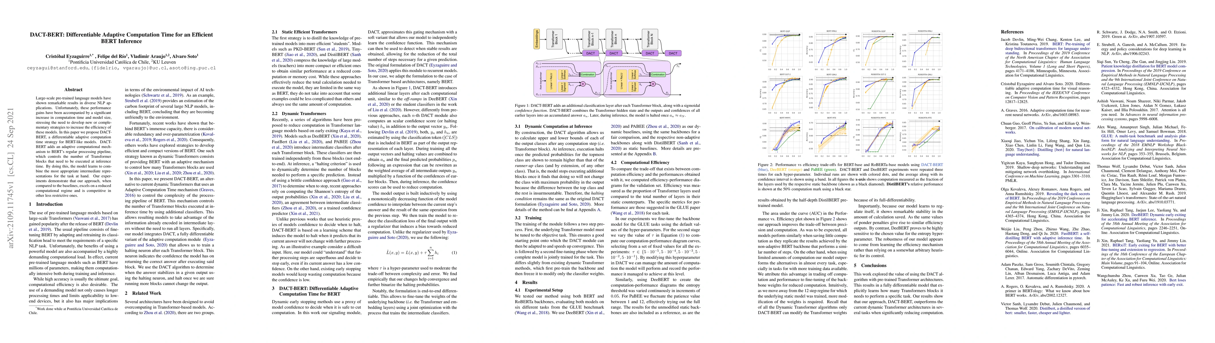 The paper introduces DACT-BERT, a method to adaptively control the number of Transformer blocks in BERT models during inference, thereby reducing computation time and model size without significantly impacting performance. Experiments show DACT-BERT outperforms baselines in low-computational regimes and remains competitive in less restrictive ones.