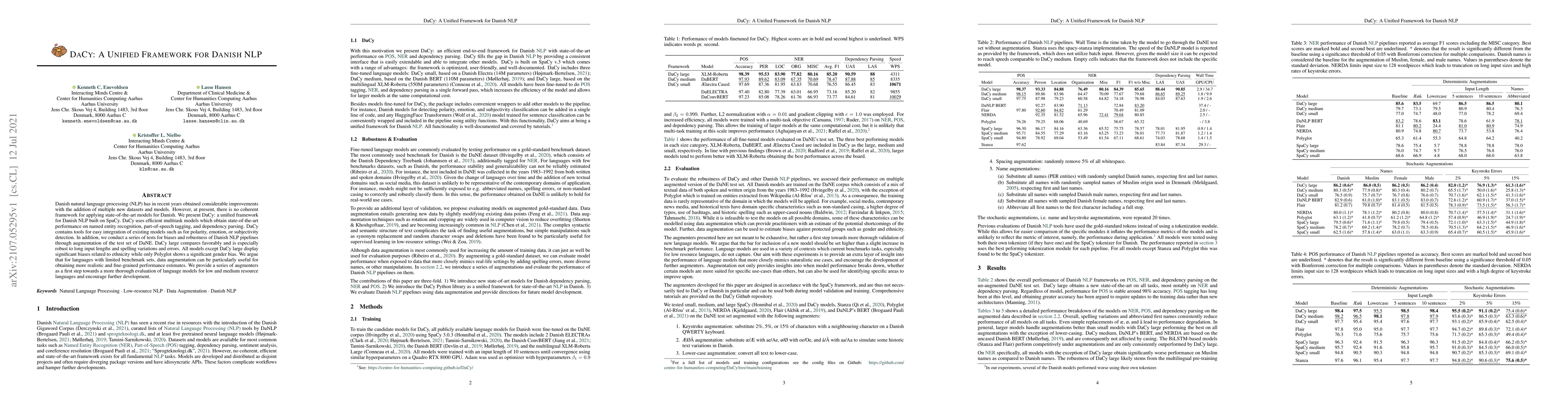 DaCy is a unified NLP framework for Danish built on SpaCy, offering state-of-the-art performance for various tasks and tools for integrating existing models. It demonstrates robustness and minimal biases, advocating for data augmentation to improve evaluations for low-resource languages.