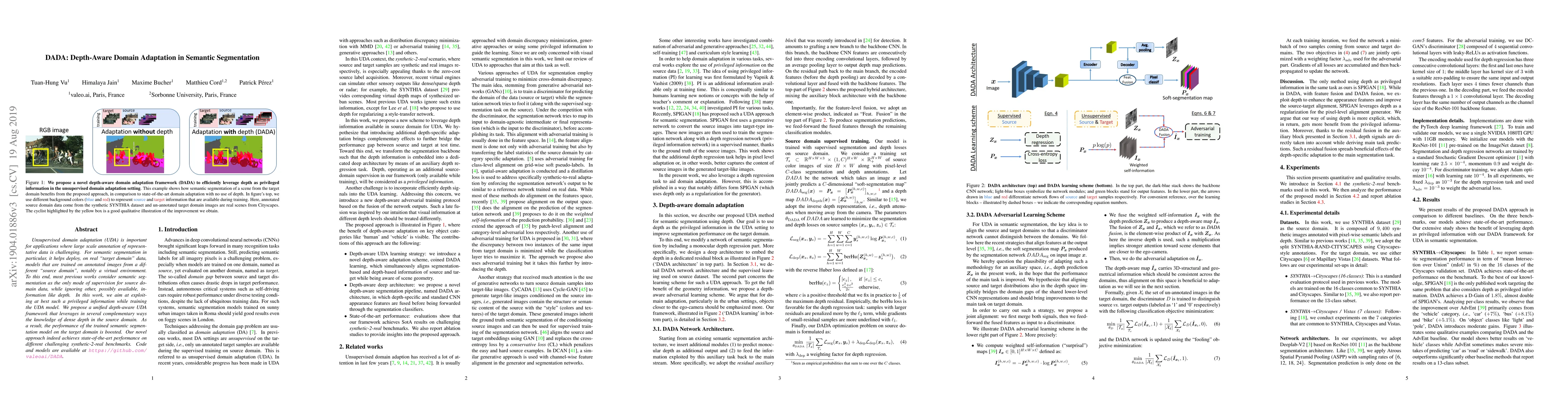 The paper proposes DADA, a depth-aware domain adaptation framework for semantic segmentation, which leverages depth information from the source domain to improve performance on the target domain. This is achieved by aligning source and target domains in both feature and depth spaces using adversarial learning.