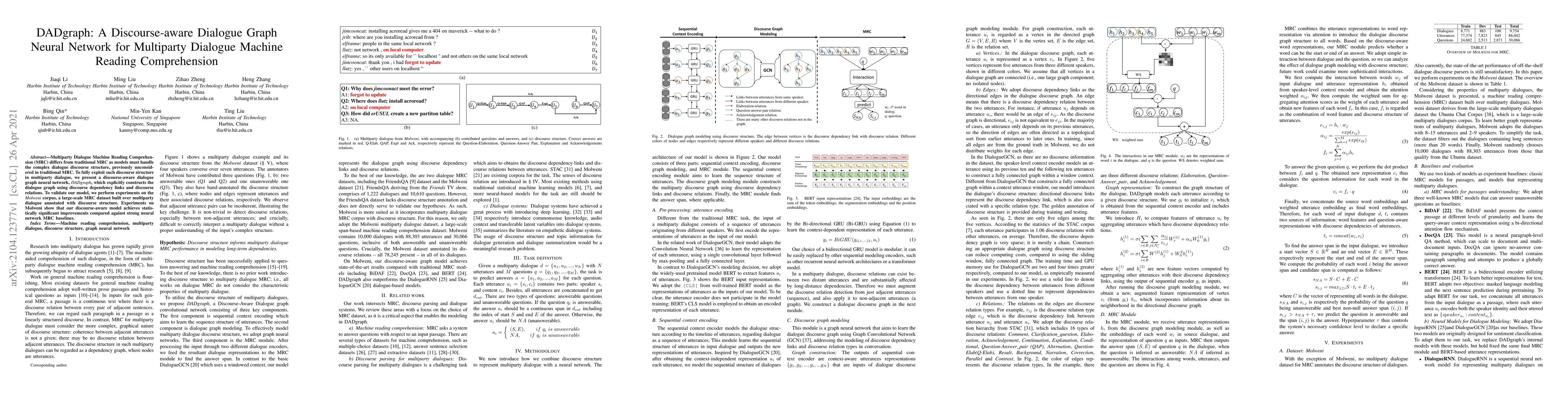 Summary: DADgraph is a novel discourse-aware dialogue graph neural network designed to improve machine reading comprehension in multiparty dialogues by exploiting complex discourse structures. Experiments on the Molweni corpus demonstrate its significant performance gains over traditional MRC baselines.