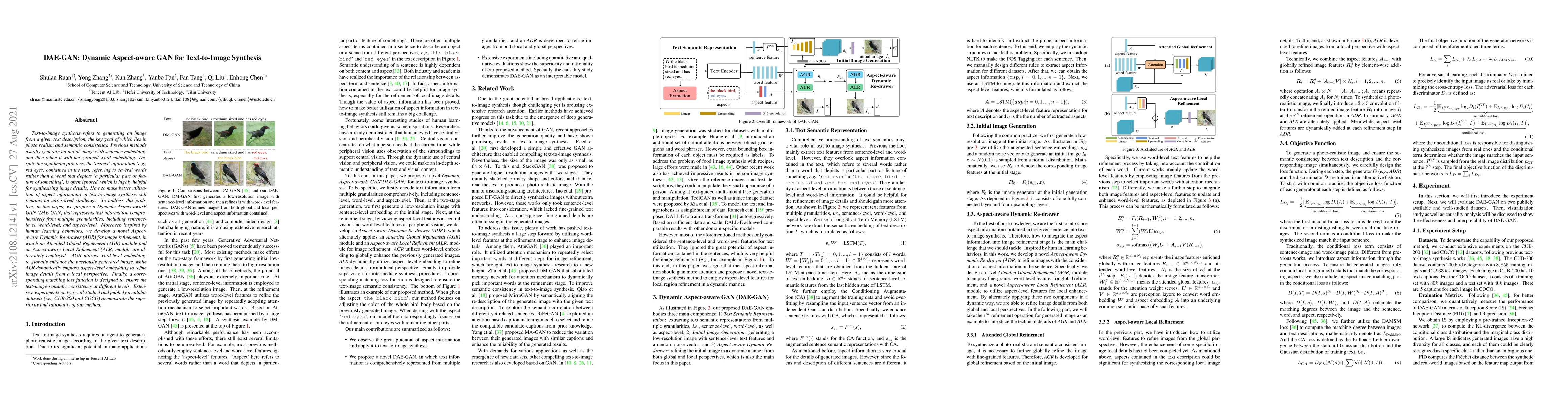 The paper proposes DAE-GAN, a Dynamic Aspect-aware GAN for text-to-image synthesis that utilizes text information at sentence, word, and aspect levels to enhance photorealism and semantic consistency. It introduces an Aspect-aware Dynamic Re-drawer with an Attended Global Refinement and an Aspect-aware Local Refinement module for detailed image refinement.
