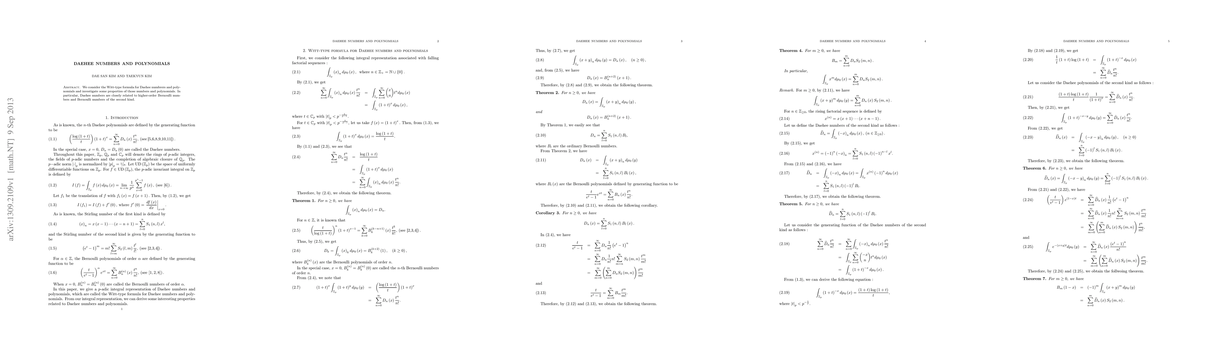 Summary: This paper explores the Witt-type formula for Daehee numbers and polynomials, examining their properties and connections to higher-order Bernoulli numbers and Bernoulli numbers of the second kind. The study highlights the relationships and implications of Daehee numbers within number theory.