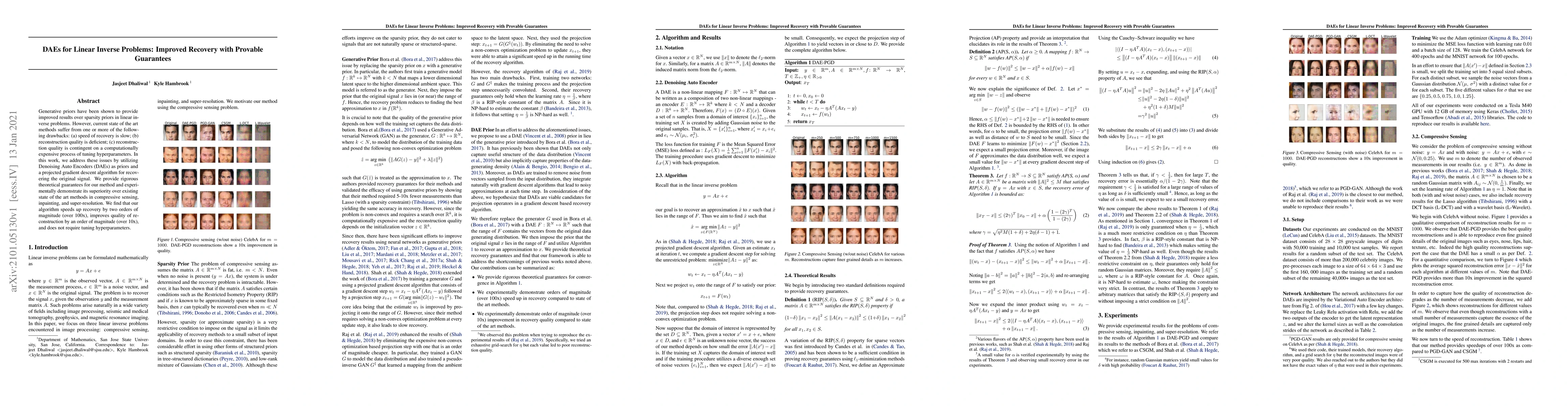 Generative priors have been shown to provide improved results over sparsity priors in linear inverse problems. However, current state of the art methods suffer from one or more of the following drawbacks: (a) speed of recovery is slow; (b) reconstruction quality is deficient; (c) reconstruction quality is contingent on a computationally expensive process of tuning hyperparameters. In this work, we address these issues by utilizing Denoising Auto Encoders (DAEs) as priors and a projected gradient descent algorithm for recovering the original signal. We provide rigorous theoretical guarantees for our method and experimentally demonstrate its superiority over existing state of the art methods in compressive sensing, inpainting, and super-resolution. We find that our algorithm speeds up recovery by two orders of magnitude (over 100x), improves quality of reconstruction by an order of magnitude (over 10x), and does not require tuning hyperparameters.