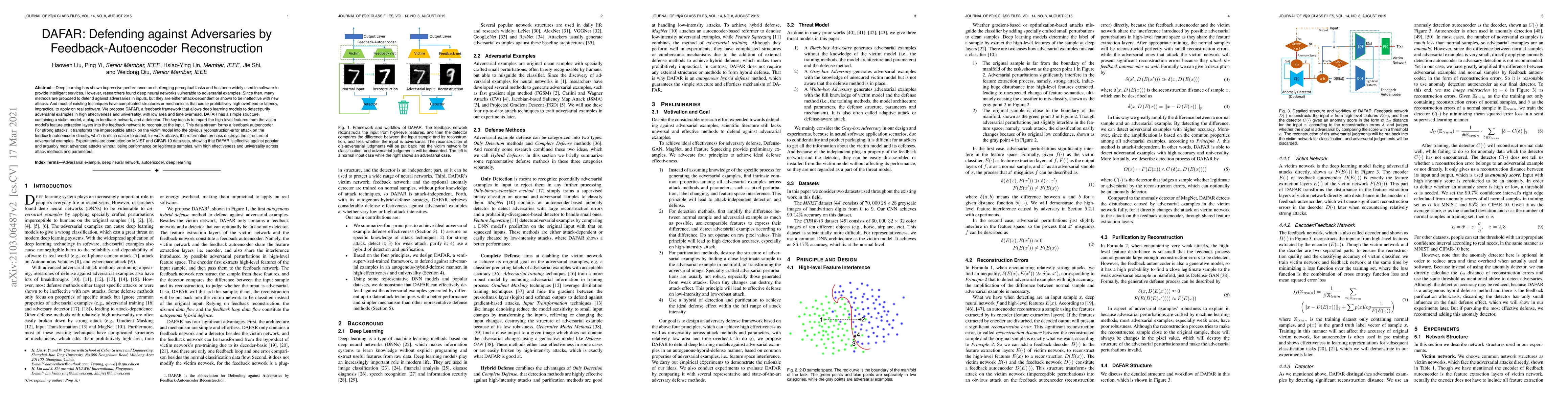Deep learning has shown impressive performance on challenging perceptual tasks and has been widely used in software to provide intelligent services. However, researchers found deep neural networks vulnerable to adversarial examples. Since then, many methods are proposed to defend against adversaries in inputs, but they are either attack-dependent or shown to be ineffective with new attacks. And most of existing techniques have complicated structures or mechanisms that cause prohibitively high overhead or latency, impractical to apply on real software. We propose DAFAR, a feedback framework that allows deep learning models to detect/purify adversarial examples in high effectiveness and universality, with low area and time overhead. DAFAR has a simple structure, containing a victim model, a plug-in feedback network, and a detector. The key idea is to import the high-level features from the victim model's feature extraction layers into the feedback network to reconstruct the input. This data stream forms a feedback autoencoder. For strong attacks, it transforms the imperceptible attack on the victim model into the obvious reconstruction-error attack on the feedback autoencoder directly, which is much easier to detect; for weak attacks, the reformation process destroys the structure of adversarial examples. Experiments are conducted on MNIST and CIFAR-10 data-sets, showing that DAFAR is effective against popular and arguably most advanced attacks without losing performance on legitimate samples, with high effectiveness and universality across attack methods and parameters.