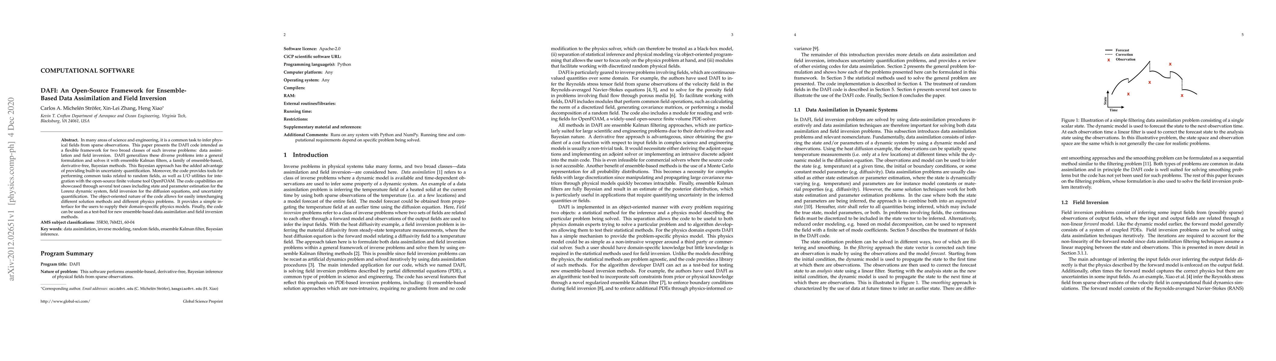 DAFI is an open-source framework for ensemble-based data assimilation and field inversion, utilizing ensemble Kalman filters for solving inverse problems and providing built-in uncertainty quantification. The code is versatile, supports integration with OpenFOAM, and allows for easy interchange of solution methods and physics models.