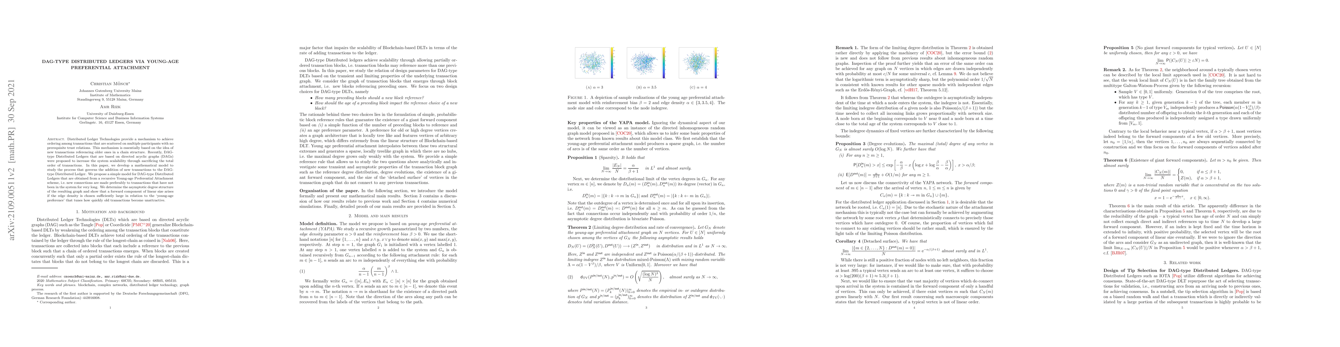 Distributed Ledger Technologies provide a mechanism to achieve ordering among transactions that are scattered on multiple participants with no prerequisite trust relations. This mechanism is essentially based on the idea of new transactions referencing older ones in a chain structure. Recently, DAG-type Distributed Ledgers that are based on directed acyclic graphs (DAGs) were proposed to increase the system scalability through sacrificing the total order of transactions. In this paper, we develop a mathematical model to study the process that governs the addition of new transactions to the DAG-type Distributed Ledger. We propose a simple model for DAG-type Distributed Ledgers that are obtained from a recursive Young-age Preferential Attachment scheme, i.e. new connections are made preferably to transactions that have not been in the system for very long. We determine the asymptotic degree structure of the resulting graph and show that a forward component of linear size arises if the edge density is chosen sufficiently large in relation to the `young-age preference' that tunes how quickly old transactions become unattractive.