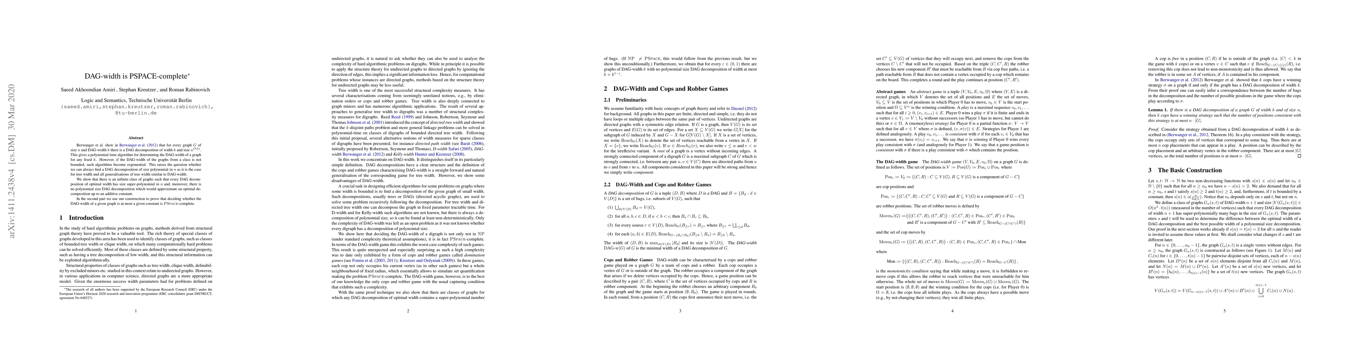 Berwanger et al. demonstrate a polynomial-time algorithm for fixed DAG-width but show that for unbounded DAG-width, optimal decompositions can be super-polynomial in size. They prove that DAG-width determination is PSPACE-complete for any given constant.