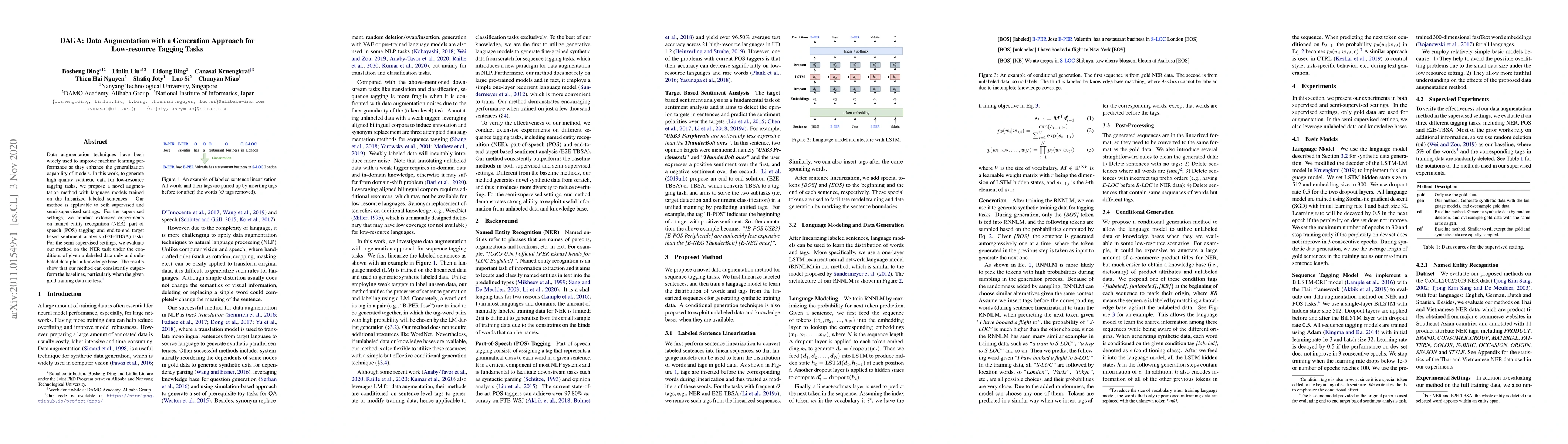 A new data augmentation method using language models improves machine learning performance on low-resource tagging tasks, outperforming baselines in supervised and semi-supervised settings.
