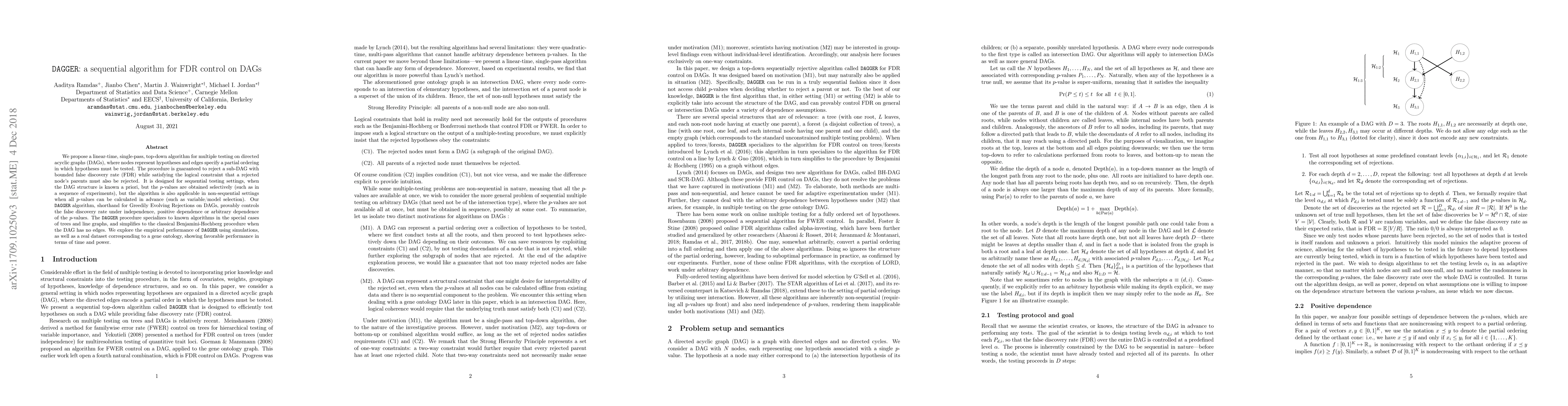 The DAGGER algorithm is a linear-time method for controlling false discovery rate (FDR) in multiple testing on directed acyclic graphs (DAGs), providing favorable performance in terms of time and power.