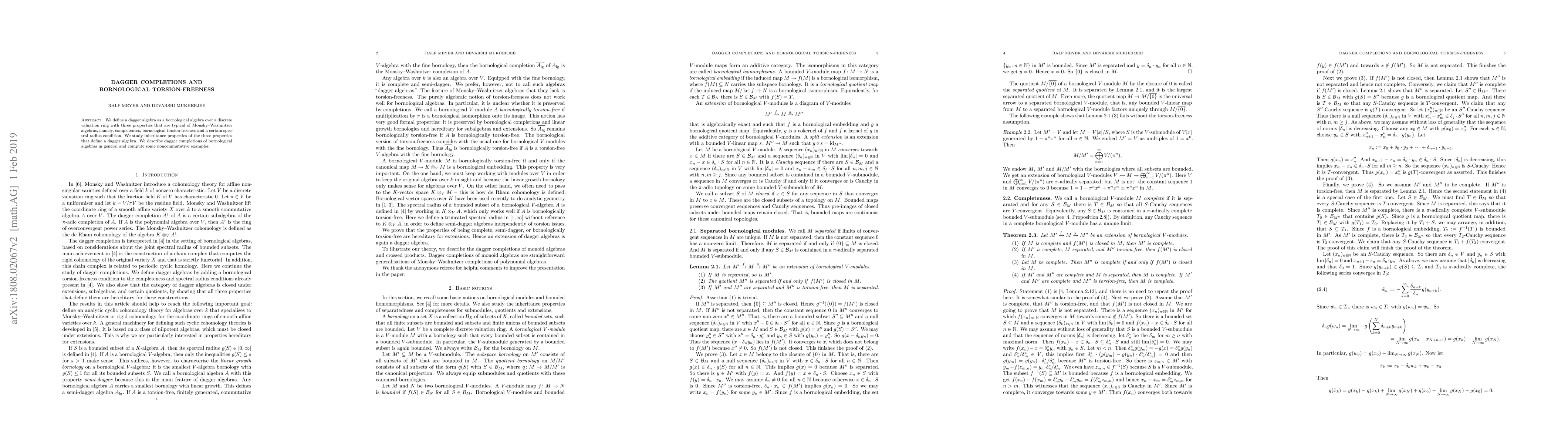 This paper defines dagger algebras as bornological algebras over a discrete valuation ring, focusing on completeness, bornological torsion-freeness, and spectral radius conditions. It explores inheritance properties of these defining traits and examines dagger completions of bornological algebras, providing noncommutative examples.