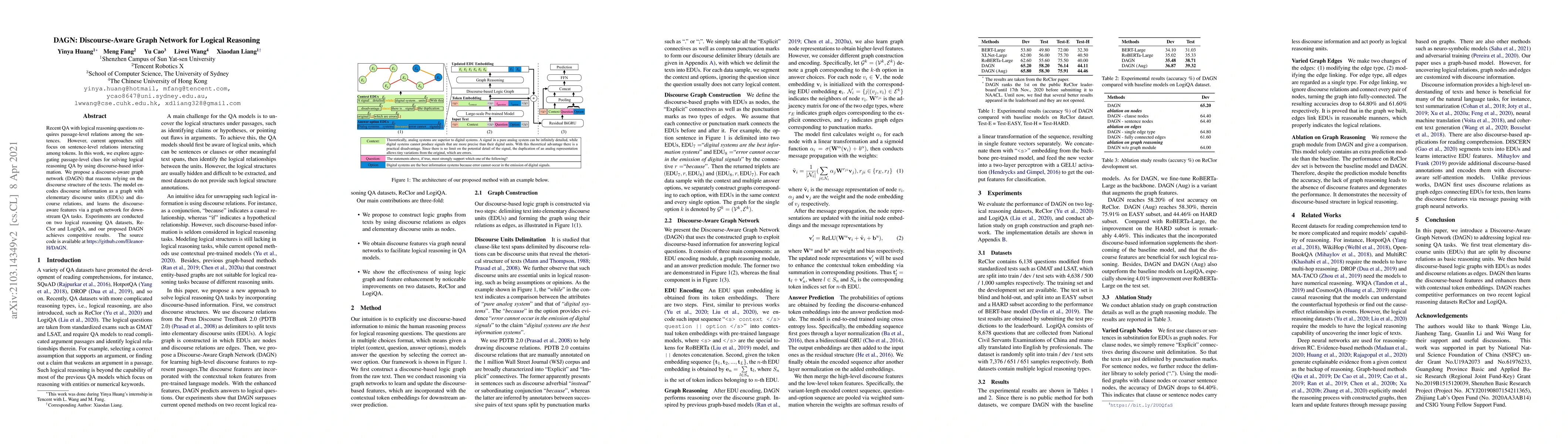 The paper introduces a Discourse-Aware Graph Network (DAGN) to improve logical reasoning in QA by leveraging discourse structure over sentence-level relations. DAGN encodes passage-level discourse information as a graph, achieving competitive results on ReClor and LogiQA datasets.