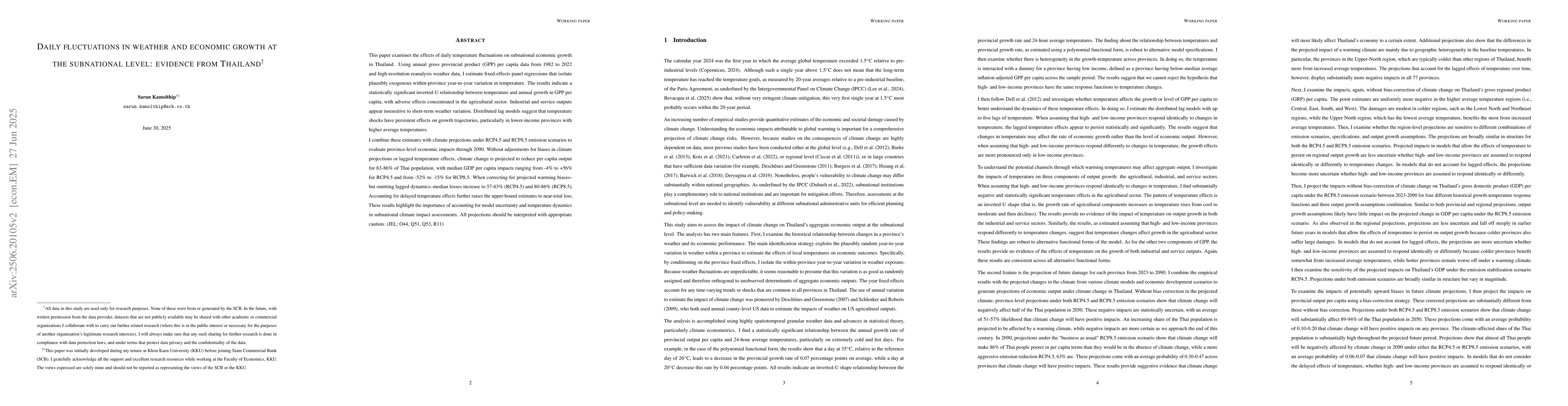 This study investigates the historical relationship between temperature fluctuations and Thailand's aggregate economic output. The results show inverted-U shape temperature effects on the annual growth rate of provincial output per capita. The estimated marginal change in the annual growth rate of provincial output per capita of a 1 degree Celsius temperature increase is between -1.248 and -3.799 percentage points, depending on the functional form used. I find that the warming temperature may affect the growth of economic output rather than its level. The results also suggest that temperature changes affect output growth only in the agricultural sector, but not in the industrial and service sectors. Province-level projections under both the RCP4.5 and RCP8.5 emission scenarios show that climate change will affect half of the Thai population by 2050. Projections show that climate change will make 62% (RCP4.5) and 86% (RCP8.5) of the Thai population poorer in per-capita terms than they would be in the absence of climate change in 2090. Nonetheless, these projections are sensitive to potential biases in future climate projections, particularly in models that do not account for lagged effects. All projections should be interpreted with caution.