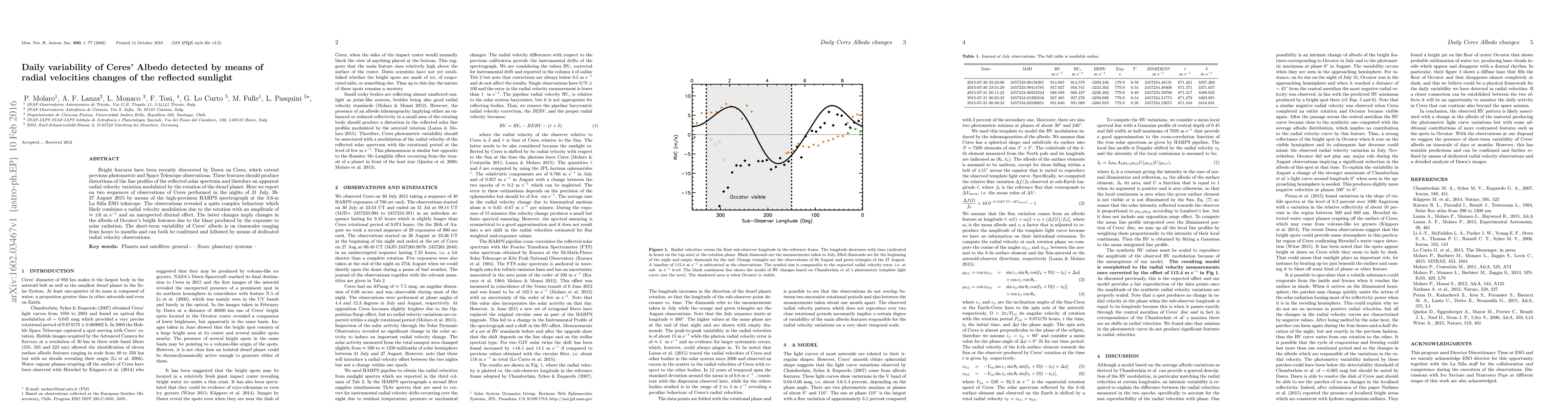 This study uses high-precision radial velocity measurements from the HARPS spectrograph to detect daily variability in Ceres' albedo, revealing complex rotational and diurnal effects likely due to the bright features on Occator. The observed changes in albedo suggest a short-term variability timescale ranging from hours to months.